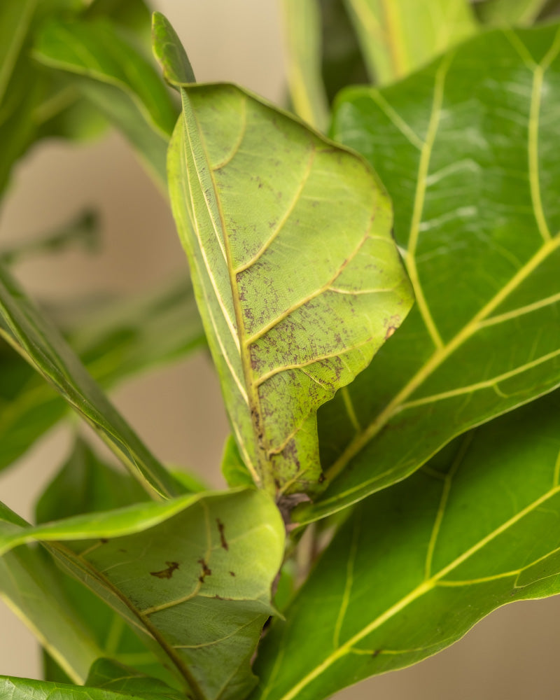 Wenn junge Blätter deiner Geigenfeige braun-rötliche Flecken aufweisen, ist das meistens ein Zeichen für zu viel Wasser. In diesem Falle platzen nämlich einzelne Zellen auf, was die Färbung bewirkt. Das kannst du von bloßem Auge erkennen, wenn du dir die Punkte genauer ansiehst.