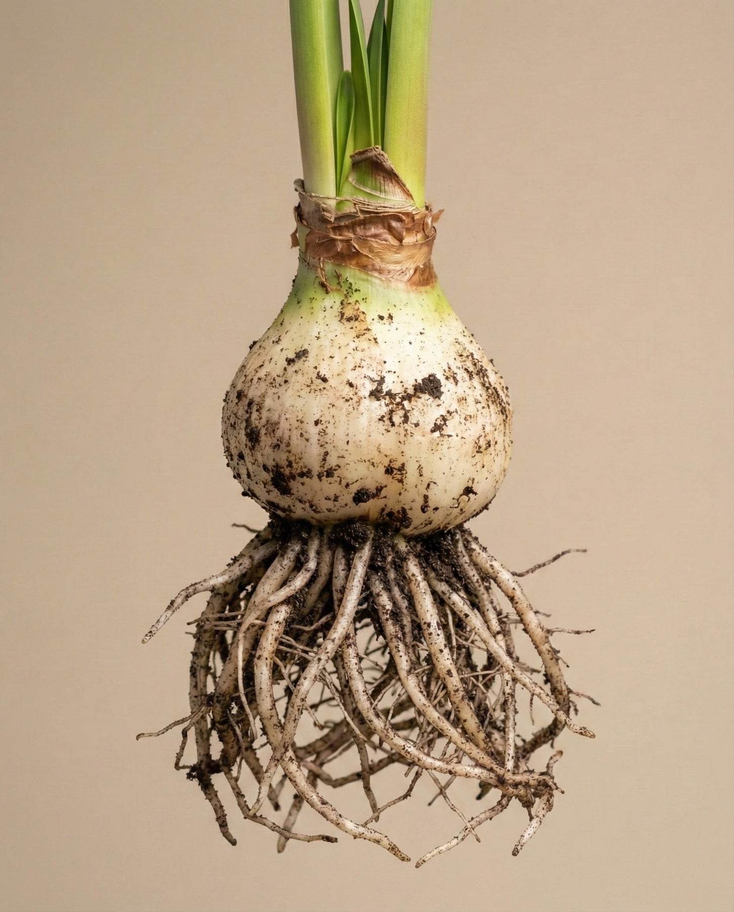Eine Nahaufnahme einer Amaryllis-Zwiebel mit freiliegenden Wurzeln und Erde auf beigem Hintergrund. Grüne Triebe sprießen aus der Spitze, und feine Wurzeln hängen unterhalb der Zwiebel.