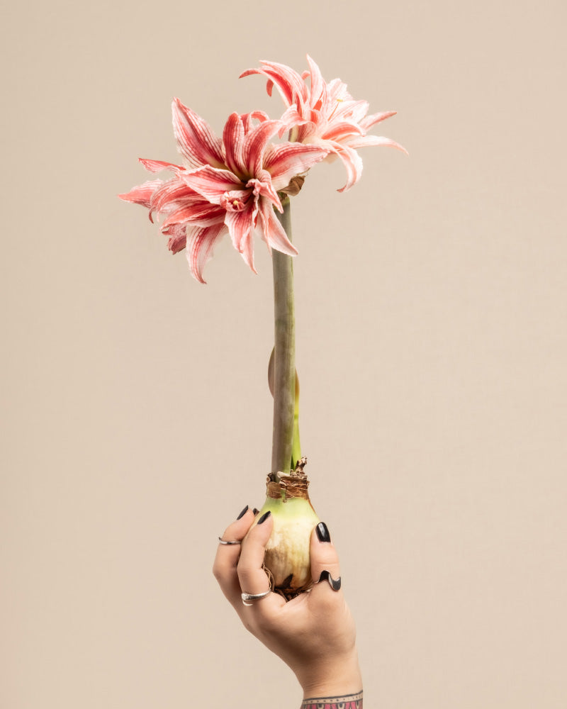 Eine Hand mit schwarzem Nagellack hält eine Amaryllis mit einem hohen grünen Stiel und rosa gestreiften Blüten vor einem schlichten beigen Hintergrund.