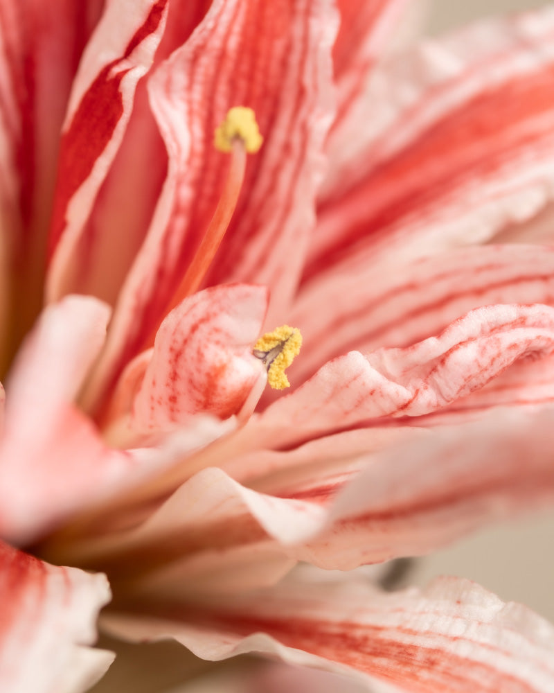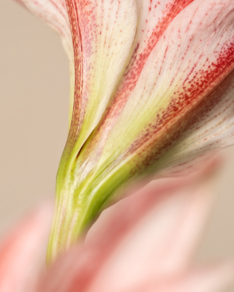 Nahaufnahme eines Amaryllisblütenblatts mit rosa und weißen Streifen auf einer strukturierten Oberfläche mit einer spitzen Spitze, zarten vertikalen Linien und vor einem neutralen beigen Hintergrund.