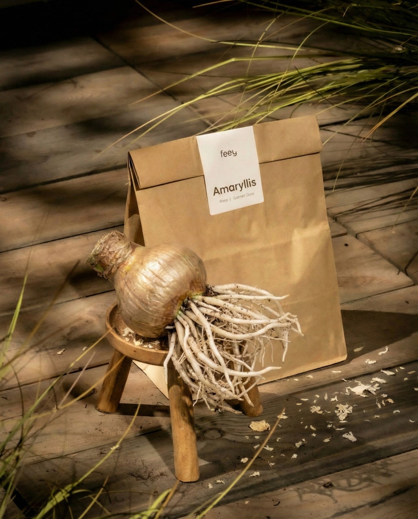 Eine Amaryllis-Papiertüte liegt auf einem Holzboden neben einer Amaryllis-Zwiebel mit freiliegenden Wurzeln, die auf einem kleinen Hocker steht, umgeben von Gras und Sonnenlicht, was ein natürliches, erdiges Gefühl vermittelt.