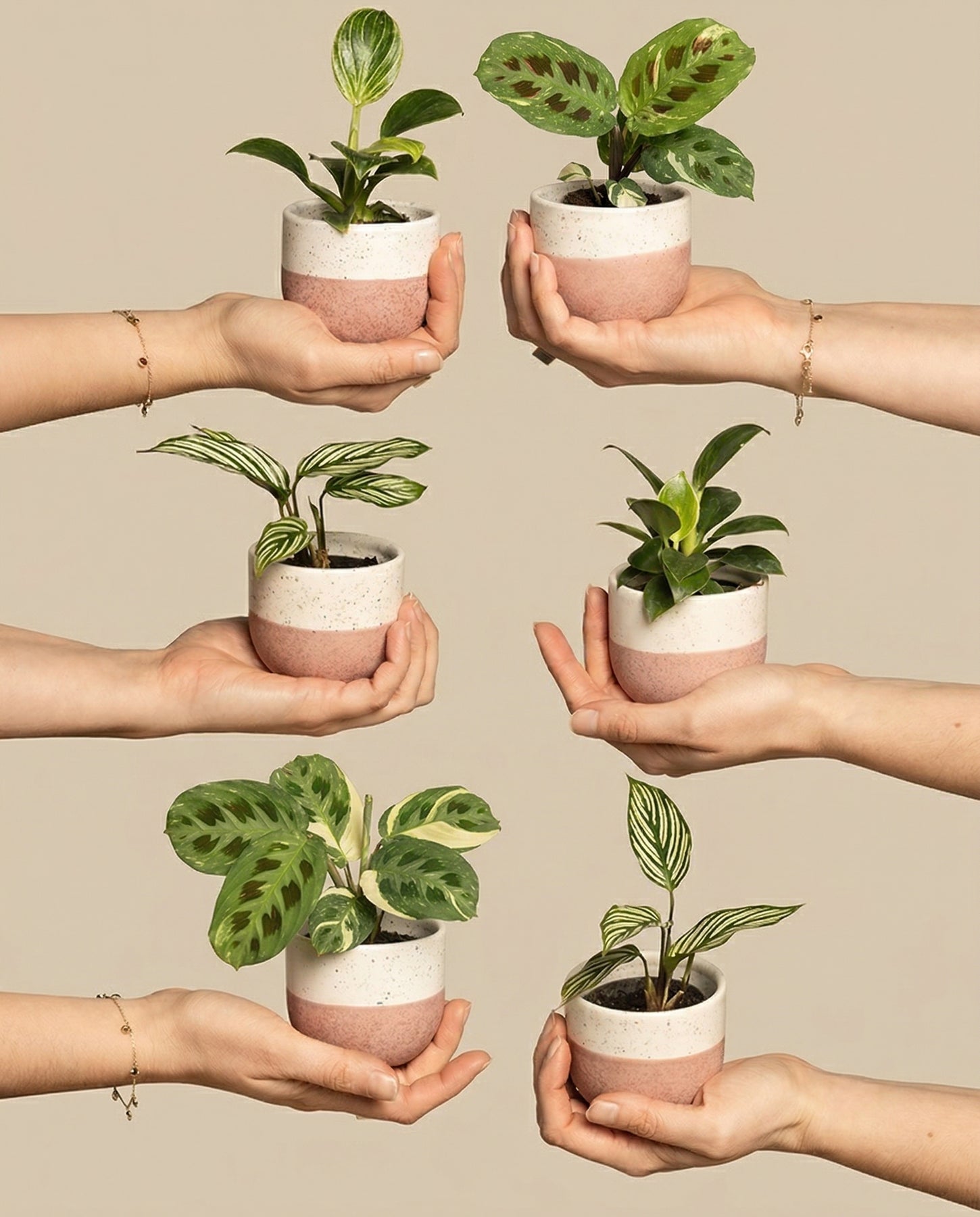 Hände präsentieren anmutig die „Babypflanzen fürs Badezimmer (6er Set)“ vor einem beigen Hintergrund. Diese sechs kleinen Topfpflanzen, darunter ein Philodendron Birkin mit üppigen grünen Blättern, stehen in weißen Töpfen mit rosa Sockeln, wobei jede Hand einzigartig positioniert ist, um eine elegante Präsentation zu gewährleisten.