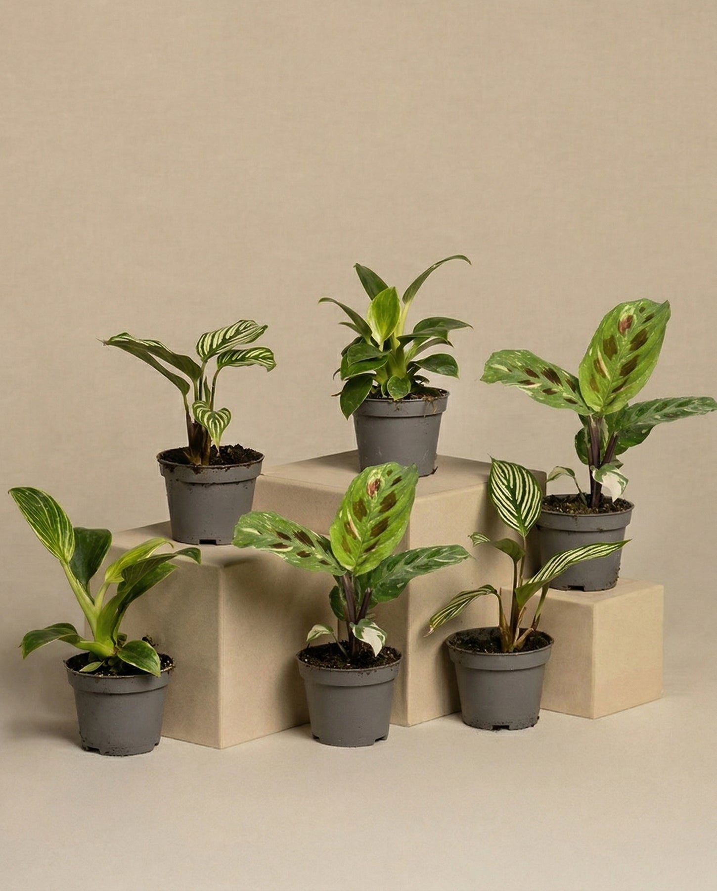 Das 6er-Set „Babypflanzen fürs Badezimmer“ umfasst sechs bezaubernde kleine Topfpflanzen, darunter einen Philodendron Birkin und eine Calathea Vittata, die elegant auf beigen Blöcken vor einem beruhigenden hellbeigen Hintergrund präsentiert werden, wodurch ihre vielfältigen grünen Blattmuster hervorgehoben werden.