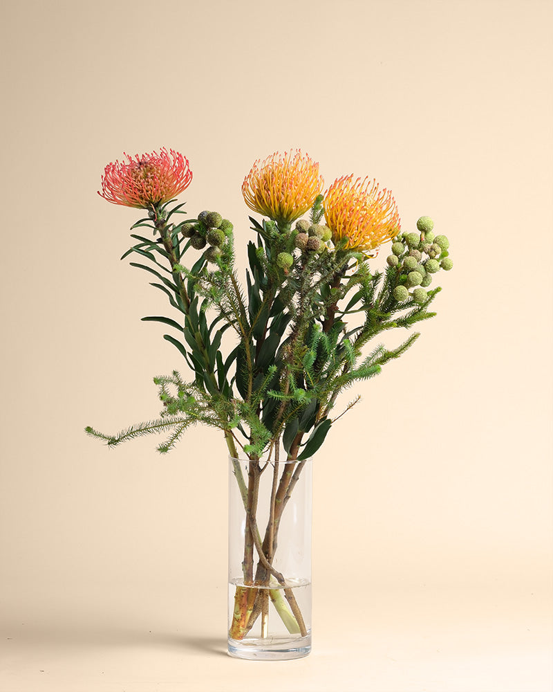Eine Klarglasvase aus der Couture-Kollektion enthält einen leuchtenden Strauß orangefarbener und rosafarbener langstieliger Nadelkissenproteen mit grünen Blättern und runden Knospen vor einem einfarbig beigen Hintergrund.