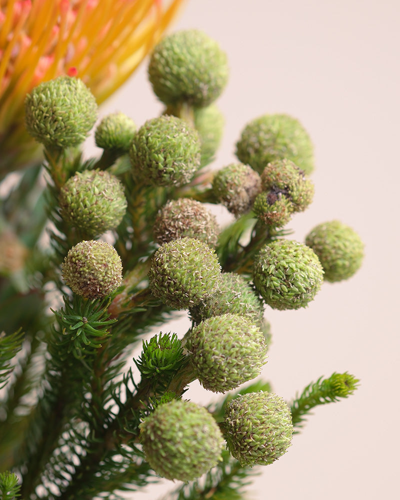 Nahaufnahme von grünen, runden Blütenbüscheln mit strukturierter Oberfläche und nadelartigen Blättern aus der Couture-Kollektion, kunstvoll arrangiert wie ein Haute-Couture-Bouquet auf hellem Hintergrund.