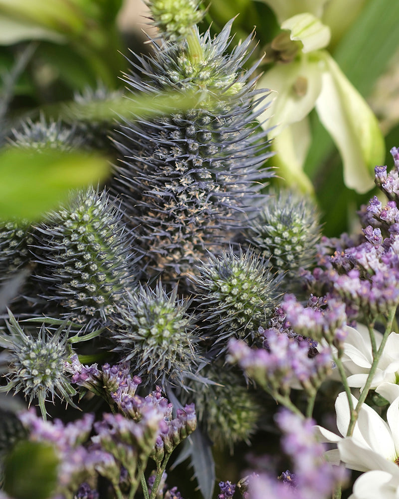 Eine Nahaufnahme der stacheligen blauen Distelblüten im Nebelmeer-Strauß, umgeben von zarten lila und weißen Blüten, mit grünem Laub im Hintergrund.