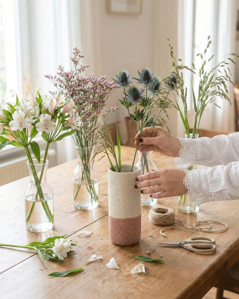 Eine Person arrangiert den Tagtraum Blumenstrauss in sanften Farben in einer Keramikvase auf einem Holztisch, umgeben von Scheren, Bindfäden, Blumenstielen, Vasen mit verschiedenen Blumen und Keramikscherben.