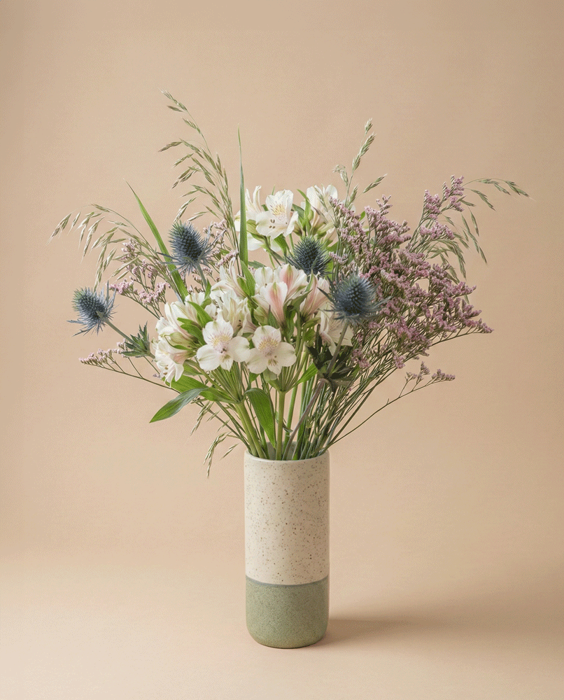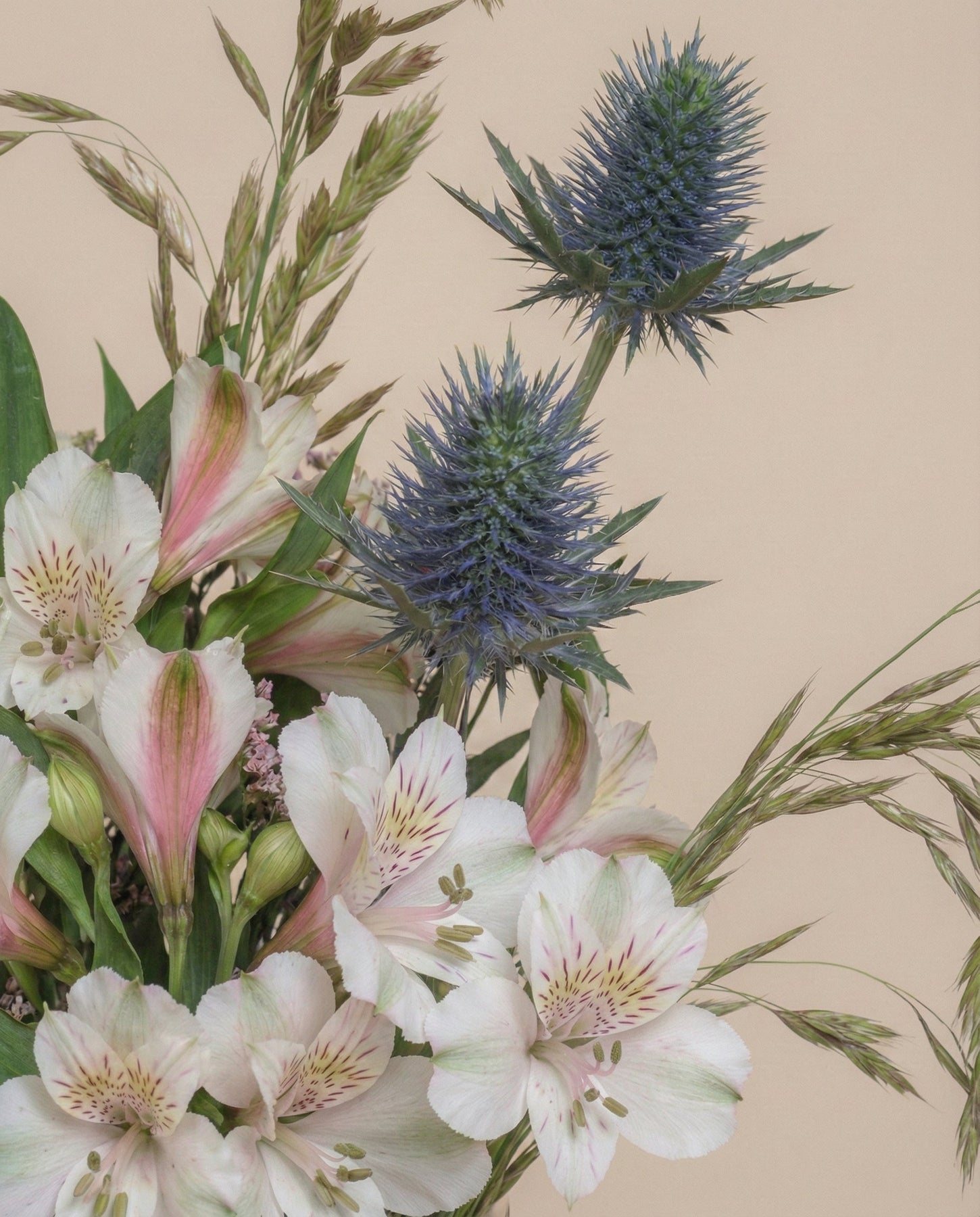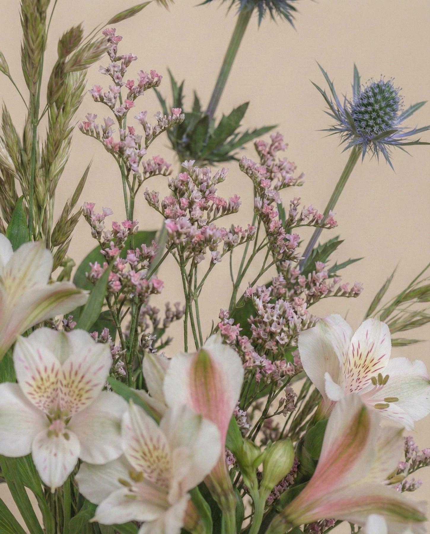 Das Blumenarrangement "Tagtraum" vereint weiße Lilien mit pinken Streifen, kleine rosa Blüten, blaue Disteln sowie grüne Blätter und Gräser vor beigem Hintergrund für einen leichten und sanft-farbigen Look.