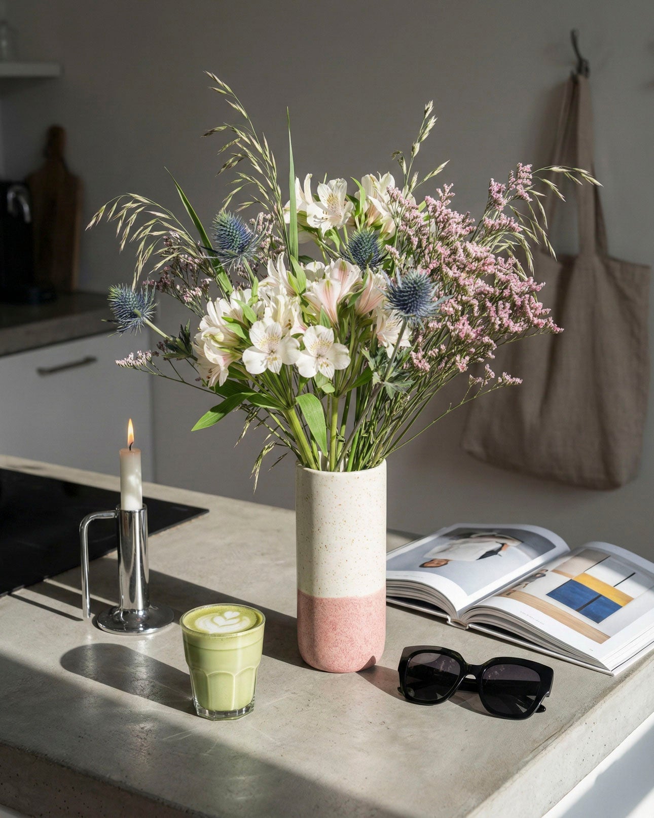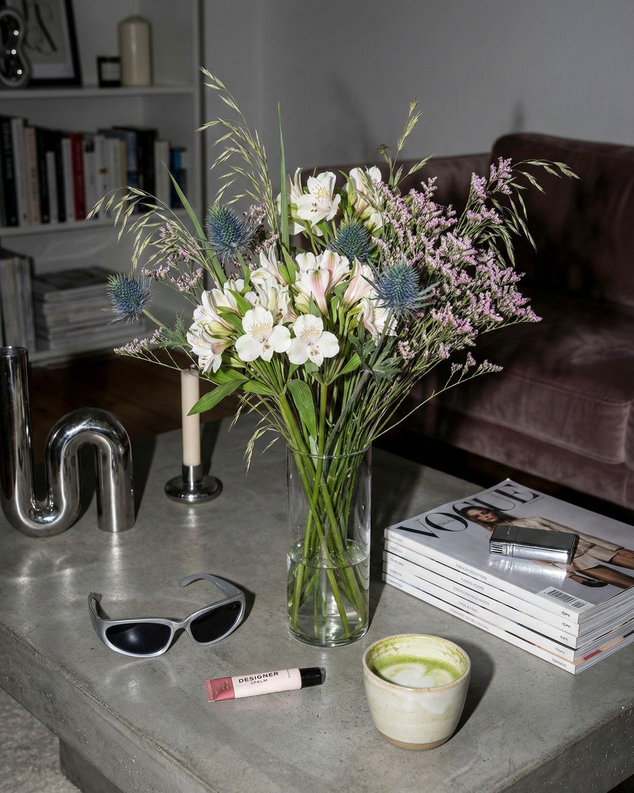 Eine Tagtraum-Glasvase mit einem zartfarbigen Blumenstrauß steht auf dem Couchtisch, umgeben von Sonnenbrillen, Sahne, Matcha und Vogue-Zeitschriften. Bücherregale und eine Kerze im Hintergrund verleihen der Szene Leichtigkeit.