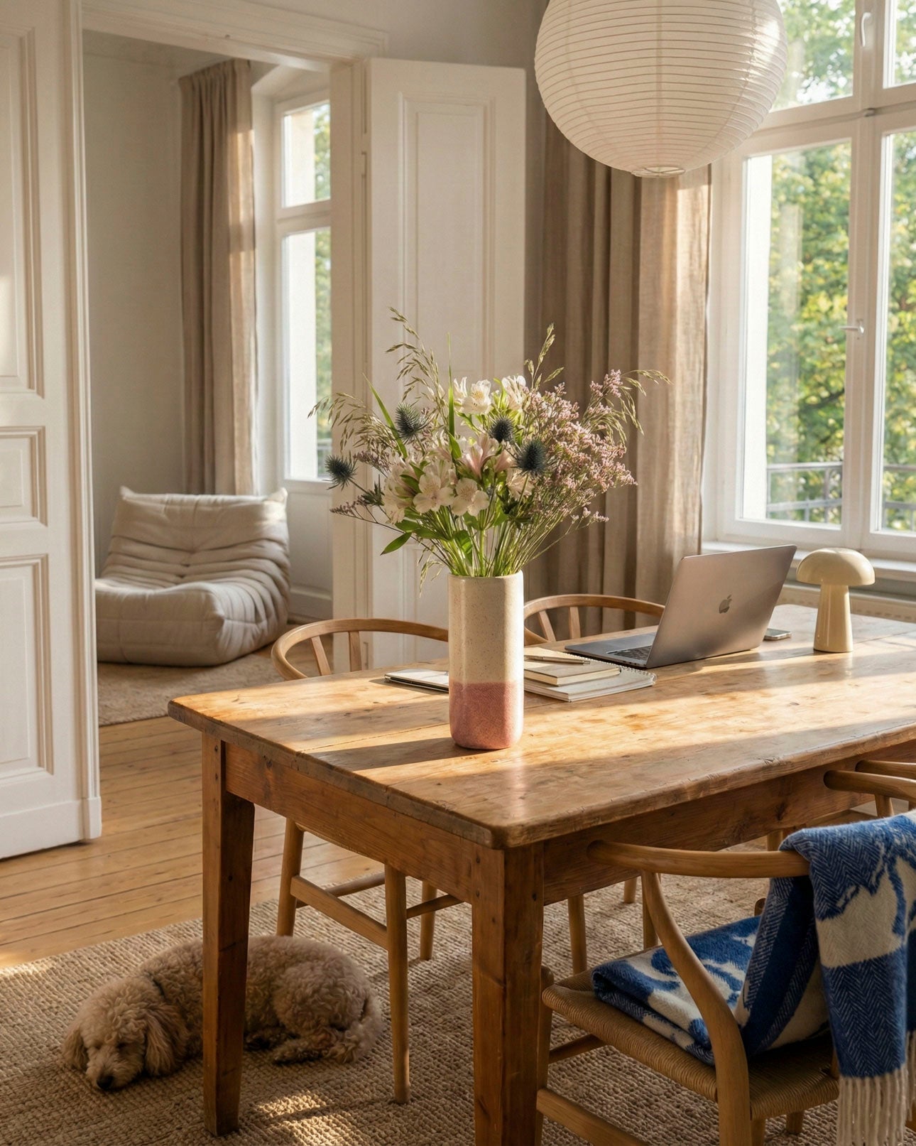 Ein sonnenbeschienenes Esszimmer mit dem Holztisch von Tagtraum, sanften Farben, einem Blumenstrauß in einer Vase, einem Laptop und einer gestreiften Decke auf einem Stuhl. Ein Hund macht ein Nickerchen auf dem Boden, während das Licht durch die großen Fenster strömt und ein Sitzsack im Nebenzimmer steht.