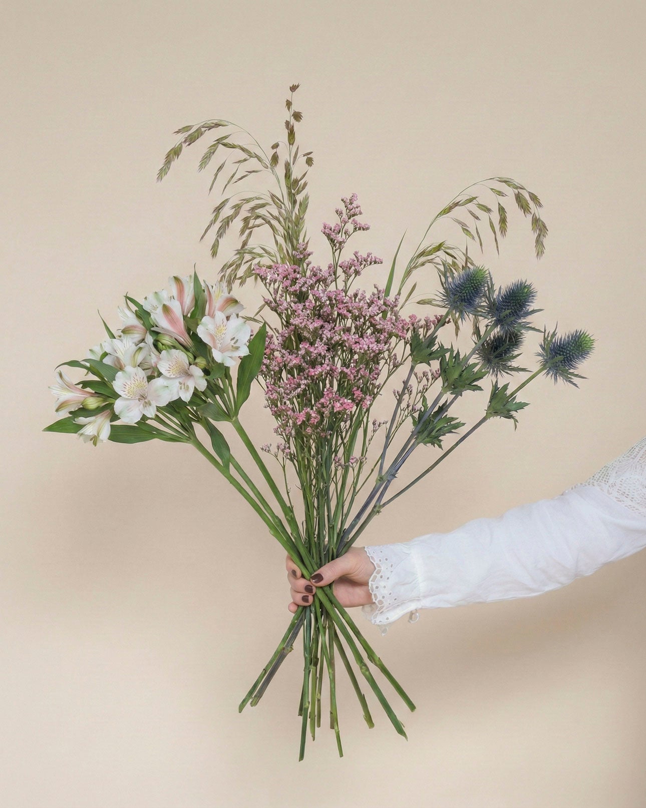 Eine Person in einem weißen Ärmel hält den Tagtraum - einen Strauß aus weißen Lilien, violetten Disteln, rosa Blüten und zartem Grün - und hebt dessen Leichtigkeit und zarte Farben vor einem schlichten beigen Hintergrund hervor.