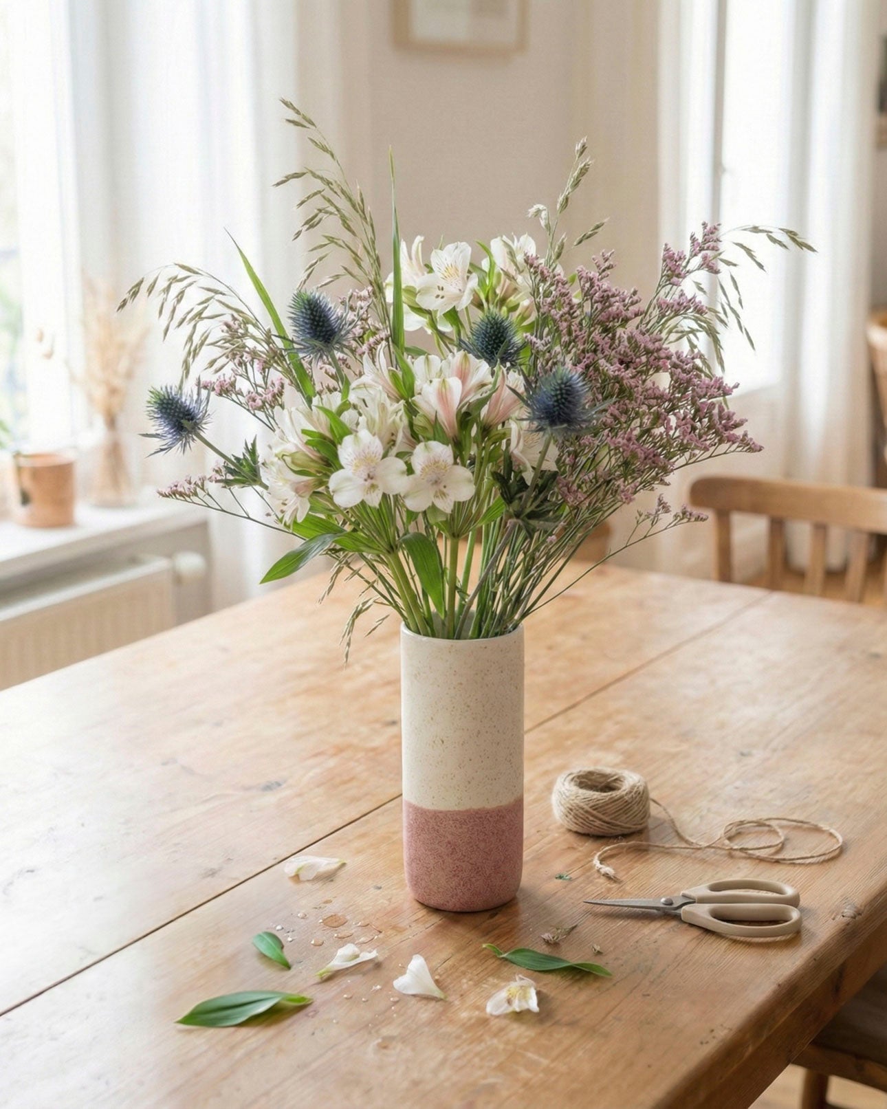 Tagtraum, eine Keramikvase mit einem Blumenstrauß in sanften Farben, steht auf einem Holztisch inmitten von Scheren, Bindfäden und verstreuten Blütenblättern, während das Sonnenlicht durch große Fenster strömt und die ruhige Szene mit Leichtigkeit erfüllt.