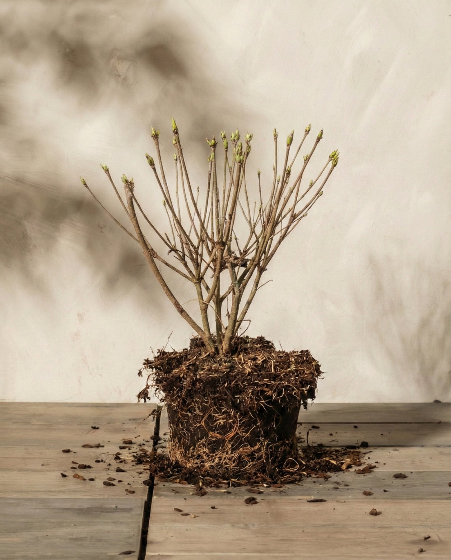 Nahaufnahme des Fußes einer Flieder-Pflanze vom Typ „Miss Kim“, aus der mehrere grüne Stängel und hellgrüne Blätter aus dem rauen, krümeligen Boden ragen. Die Stängel der Pflanze weisen kleine Beulen und Strukturen auf, die auf ihren Gesundheitszustand hinweisen.