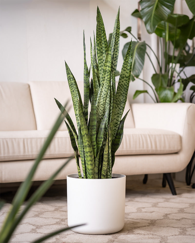 Eine Große Grüne Schwiegermutterzunge, auch Sansevieria trifasciata genannt, in einem weißen Keramiktopf steht in einem modernen Wohnzimmer mit hellbeigen Möbeln, im Hintergrund steht eine Couch. Der Raum ist mit weiteren Grünpflanzen ausgestattet, die eine frische und natürliche Atmosphäre schaffen.