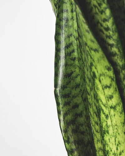 Nahaufnahme von drei Blättern der Großen Grünen Schwiegermutterzunge, auch Grüne Sansevieria genannt, mit ihren charakteristischen grün- und hellgrünen bunten Mustern. Die Texturen und gesprenkelten Muster verleihen den Blättern ein auffälliges, natürliches Aussehen. Ideale Pflanzenhöhe 55 bis 65 cm.