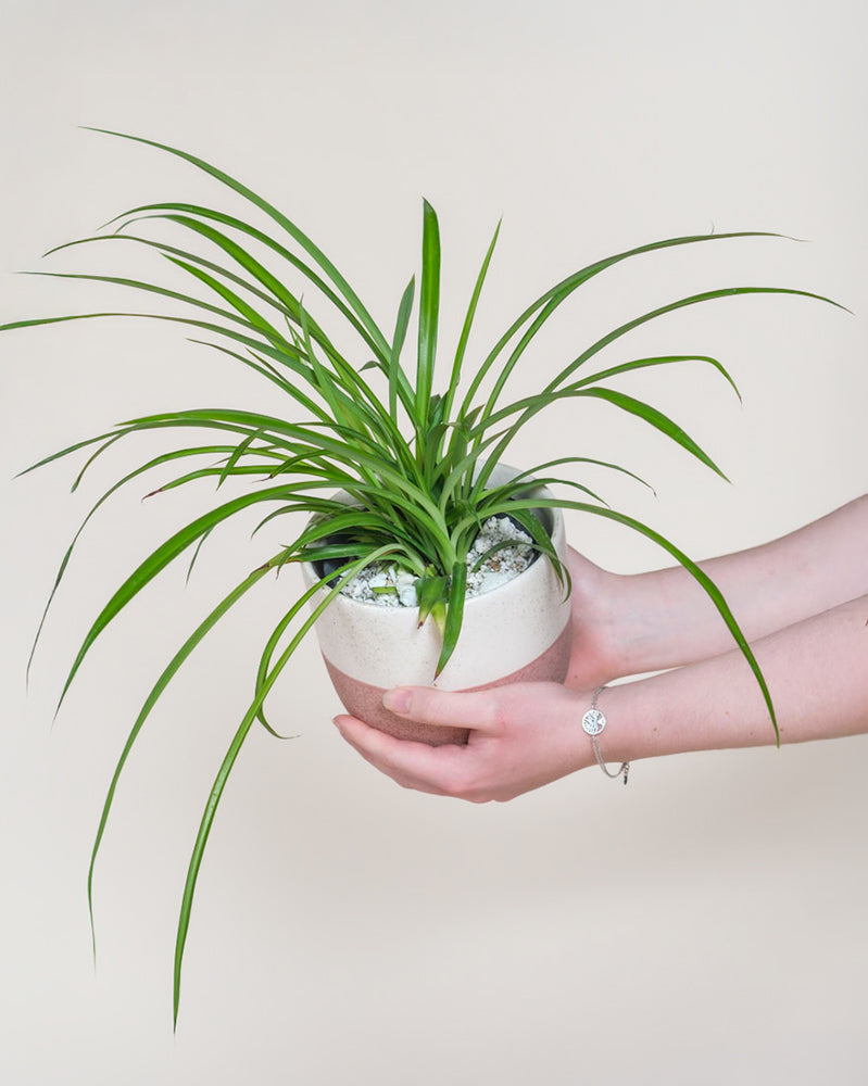 Frühling - Sommer: Mache alle 7 Tage den Fingertest, bevor du deinen Chlorophytum gießt. Dafür steckst du einen Finger 3-4 cm ins Substrat. Bröckelt es staubtrocken vom Finger, ist es Zeit, deiner Pflanze Wasser zu geben.