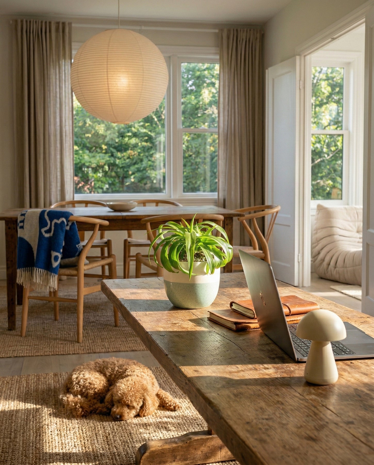 Ein gemütliches, sonnendurchflutetes Esszimmer mit Holzmöbeln und einem Tisch, auf dem ein Laptop, ein Notebook, eine Lampe und eine üppige Grünlilie "Green Bonnie" stehen. Ein kleiner Hund schläft auf dem Teppich, während große Fenster den Blick auf die grünen Bäume draußen freigeben.