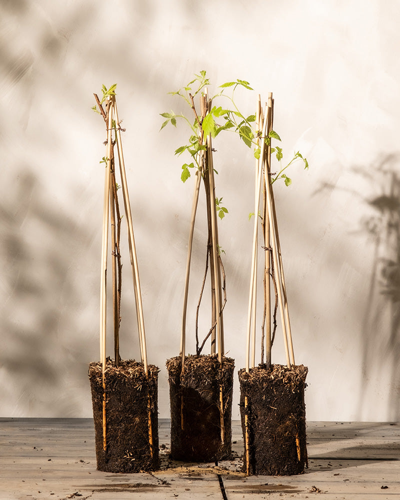Drei Hände halten jeweils eine junge Himbeerpflanze aus dem Himbeere-Trio, deren Wurzeln und Erde freiliegen, vor einem beigen Hintergrund mit Blattschatten, der an den Geist der Selbstversorgung erinnert.