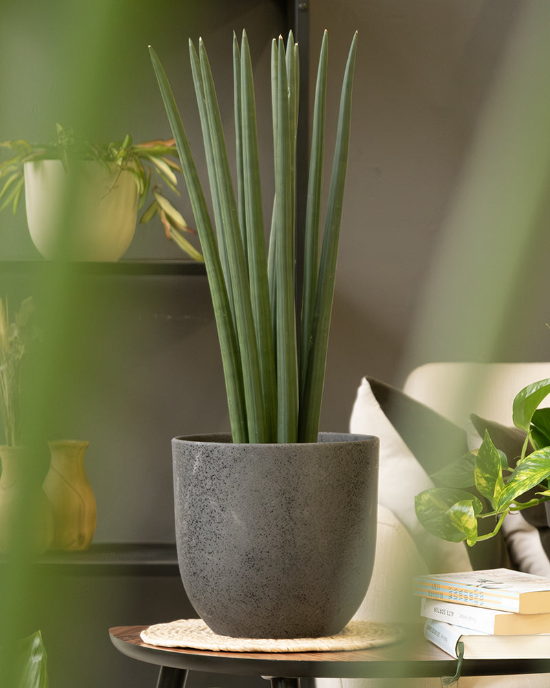 Eine große Schlangenpflanze mit schlanken, aufrechten Blättern steht in einem Keramik-Topfset &