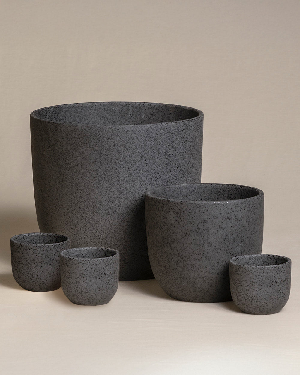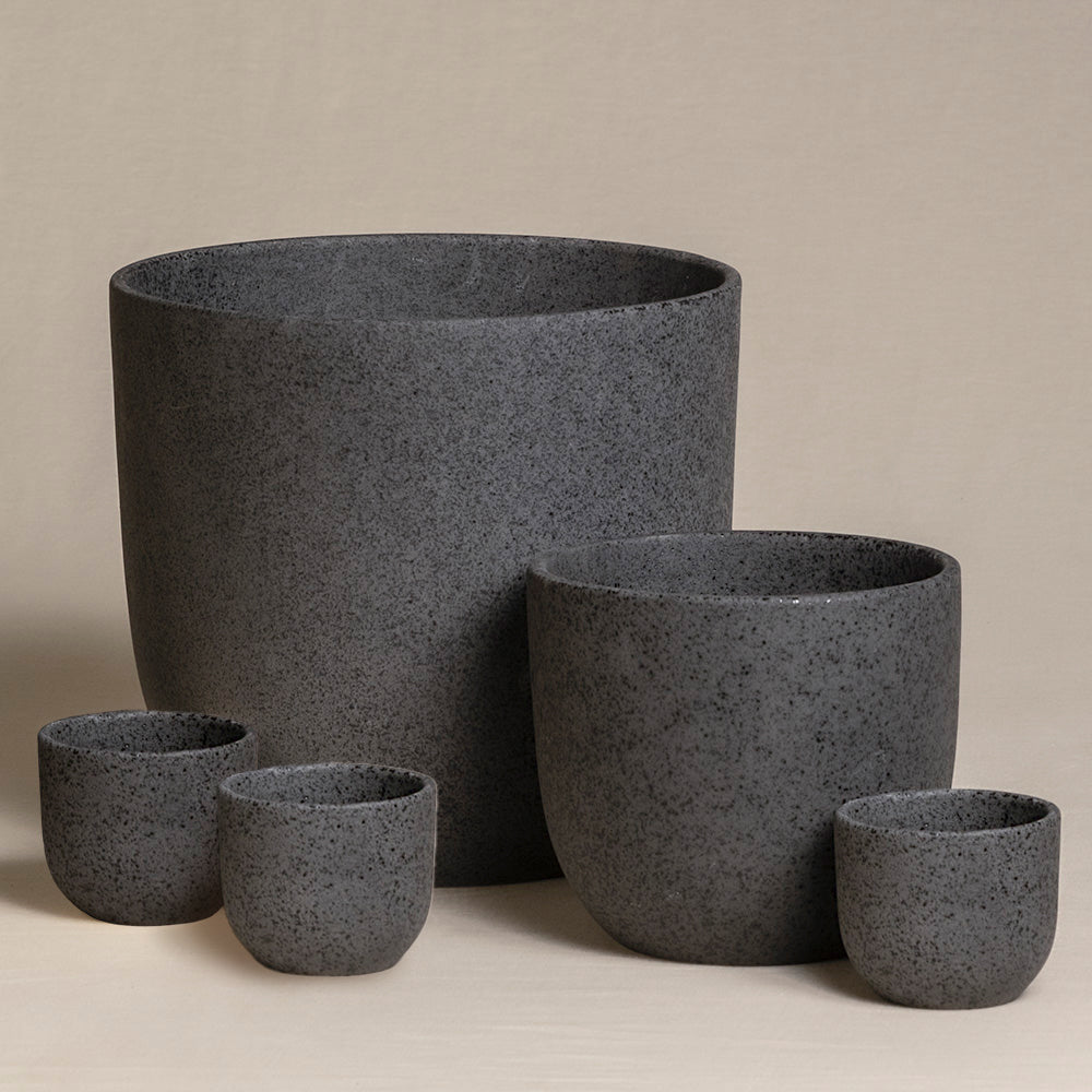 Nahaufnahme von zwei handgefertigten, matt dunkelgrauen Keramik-Topfsets &