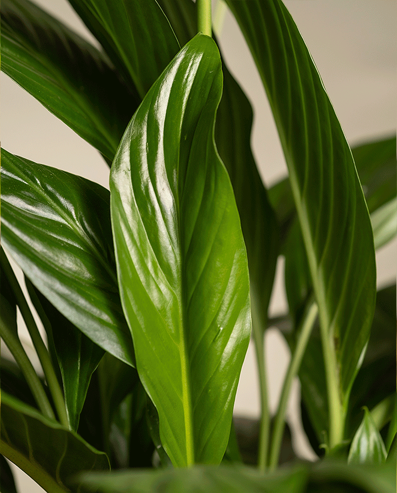 Nahaufnahme von leuchtend grünen Blättern mit ausgeprägten Adern und glänzender Textur, die die längliche Form von Nematoden gegen Trauermücken Zimmerpflanzen vor einem neutralen Hintergrund hervorheben.
