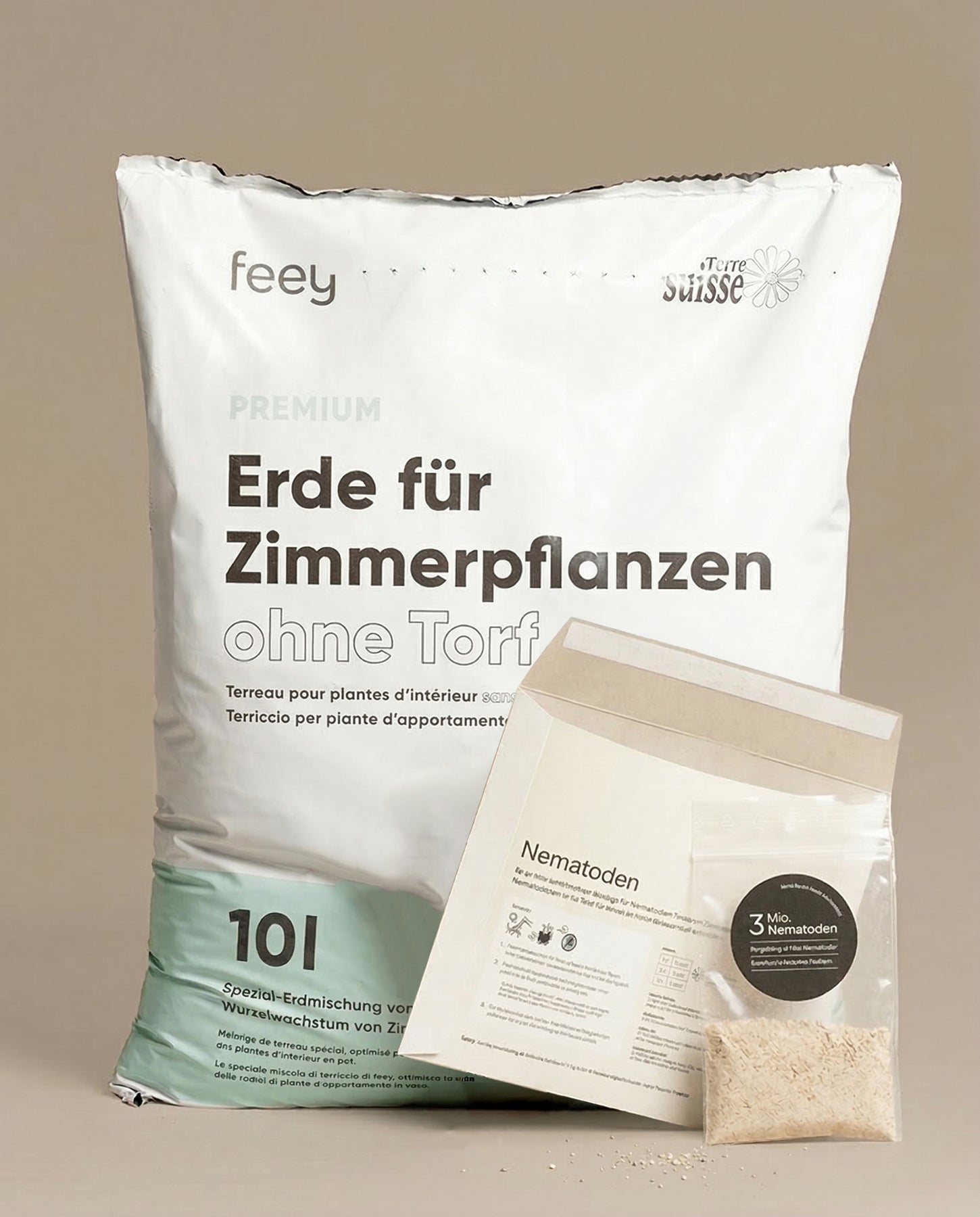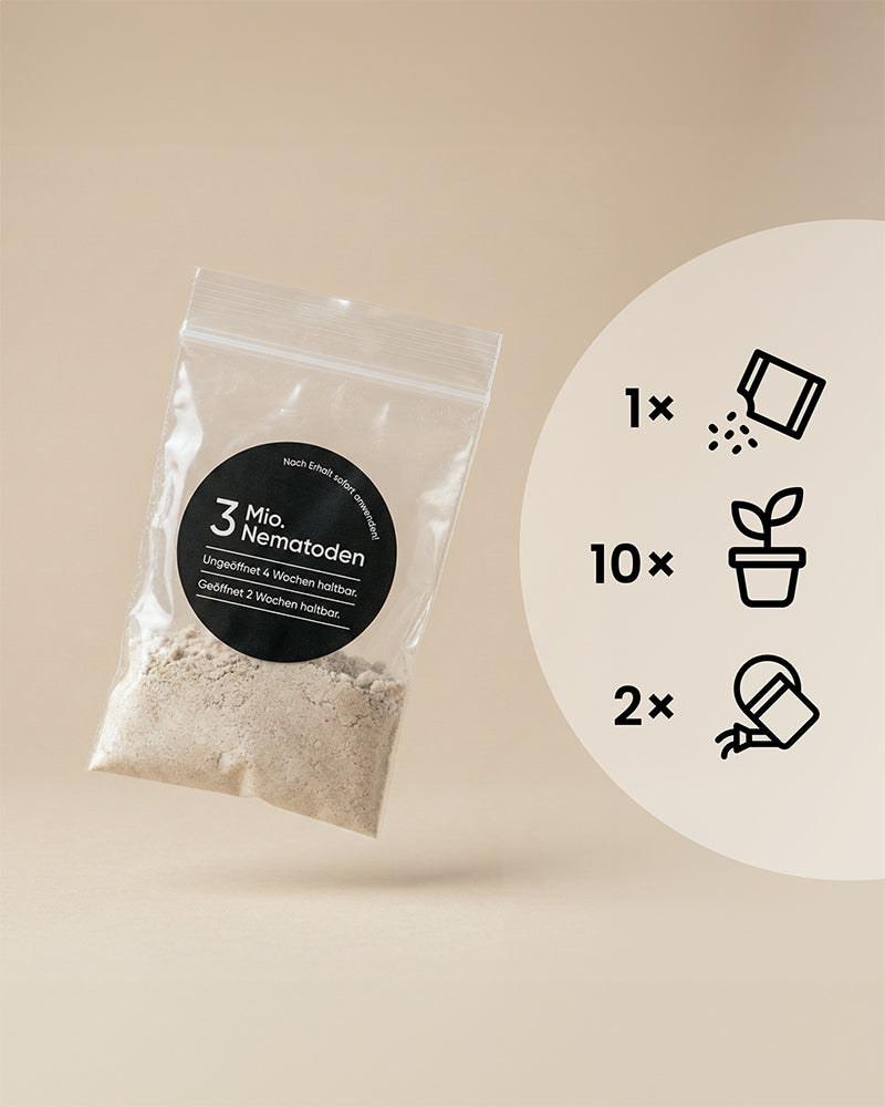 Eine durchsichtige Tüte mit der Aufschrift "Nematoden gegen Trauermücken" liegt auf Beige. Icons zeigen: 1 Päckchen reicht für 10 Zimmerpflanzen bei 2 Bewässerungen.