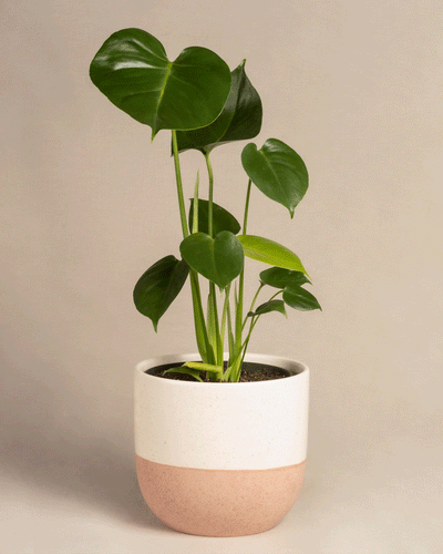 Eine große, grüne Monstera-Pflanze mit herzförmigen Blättern wächst in einem zweifarbigen Topf mit weißem Deckel und rosafarbenem Boden vor einem neutralen Hintergrund. Sie verleiht dem Raum sofort tropische Vibes.