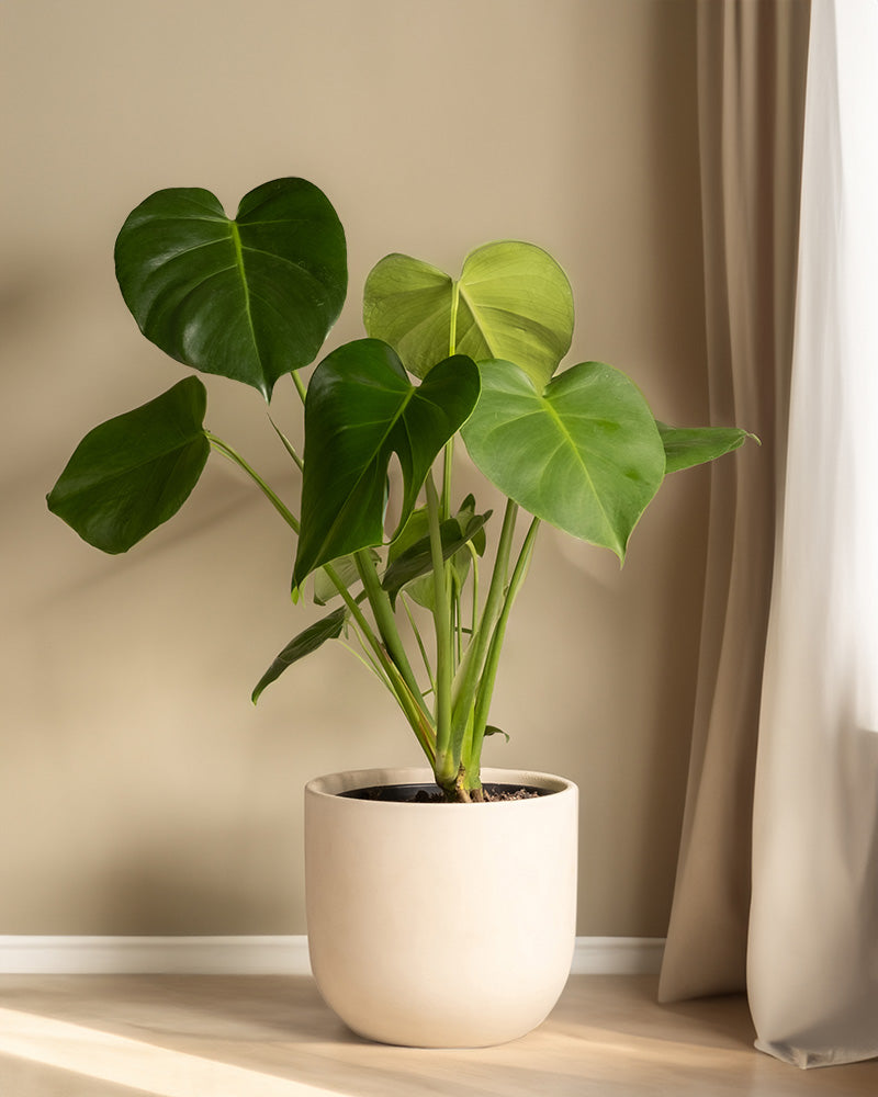 Eine Monstera im Topf mit großen, glänzenden, herzförmigen Blättern steht vor einem neutralen Hintergrund. Der schlichte, helle Topf betont das leuchtende Grün der Monstera und verleiht jedem Raum tropische Atmosphäre.
