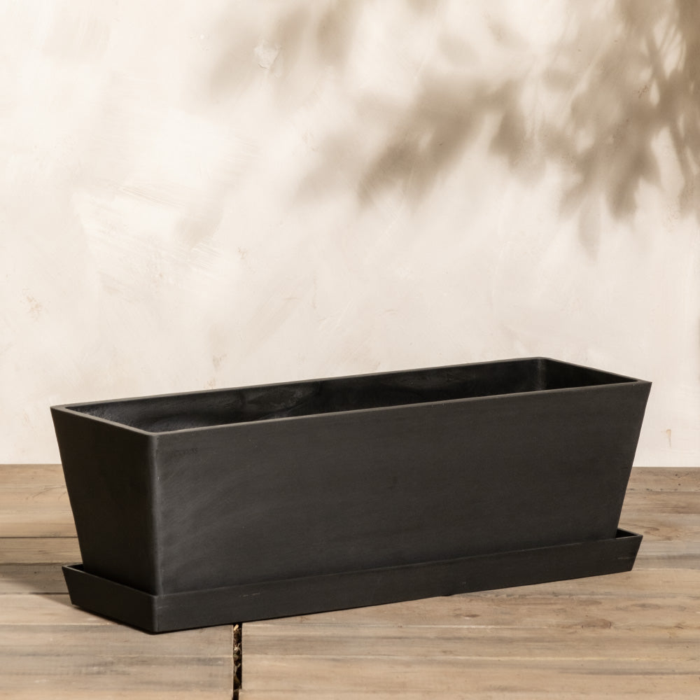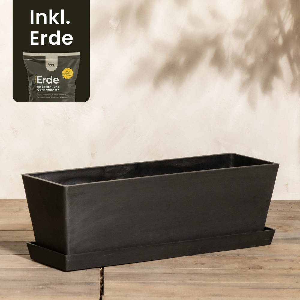 Ein rechteckiger schwarzer Pflanzkasten (Bruges | 55 cm) mit passendem Untersetzer steht auf einer Holzfläche vor einer neutralen Wand. Der mit einem effizienten Entwässerungssystem ausgestattete Pflanzkasten ist in der oberen linken Ecke mit dem deutschen Text „Inkl. Erde“ versehen, der darauf hinweist, dass Erde enthalten ist.