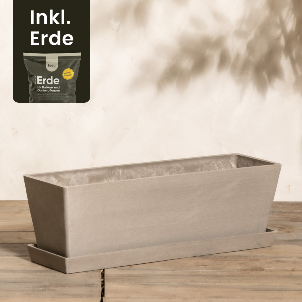 Ein rechteckiger, beiger Pflanzkasten (Bruges | 55 cm) mit aufgesetztem Tablett steht auf einer Holzfläche vor einer hellen Wand. Im Hintergrund ist ein Schatten von Blättern zu sehen. Ein kleines eingefügtes Bild zeigt eine Tüte mit der Aufschrift „Erde“ und dem Text „Inkl. Erde“.