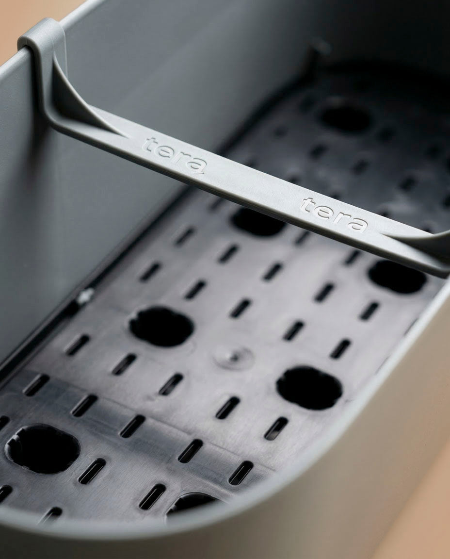 Nahaufnahme eines grauen Pflanzkastens (Paros | 60 cm) mit einem geschlitzten schwarzen Tablett im Inneren und einem "tera"-Griff. Die vielen Löcher der Schale bieten eine hervorragende Drainage, ideal für Balkonpflanzen oder kleine Topfpflanzen.