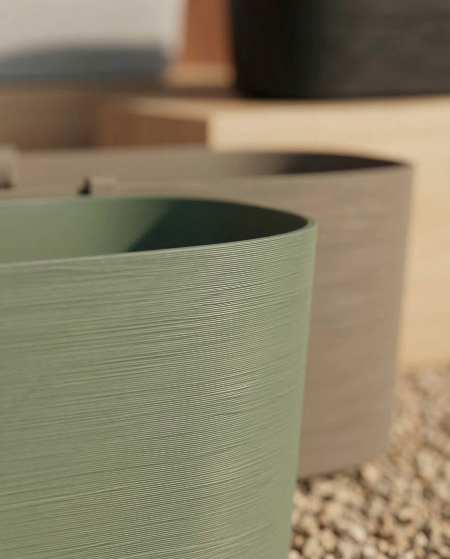 Nahaufnahme eines strukturierten, ovalen Pflanzkastens (Paros | 60 cm) mit Drainage in gedämpftem Grün und Beige, der auf Kieselsteinen steht. Im Hintergrund sind stilvolle Pflanzgefäße in sanften, neutralen Tönen zu sehen.