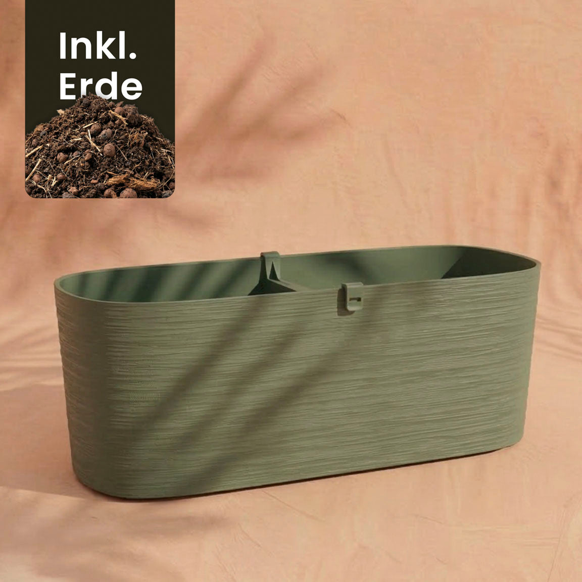 Ein grün strukturierter Pflanzkasten (Paros | 60 cm) ruht auf einer pfirsichfarbenen Oberfläche. Ein Einsatz oben links zeigt Erde mit dem Text "Inkl. Erde" (inklusive Erde), perfekt für Balkonpflanzen. Weiche Schatten vervollständigen diese ruhige Darstellung.