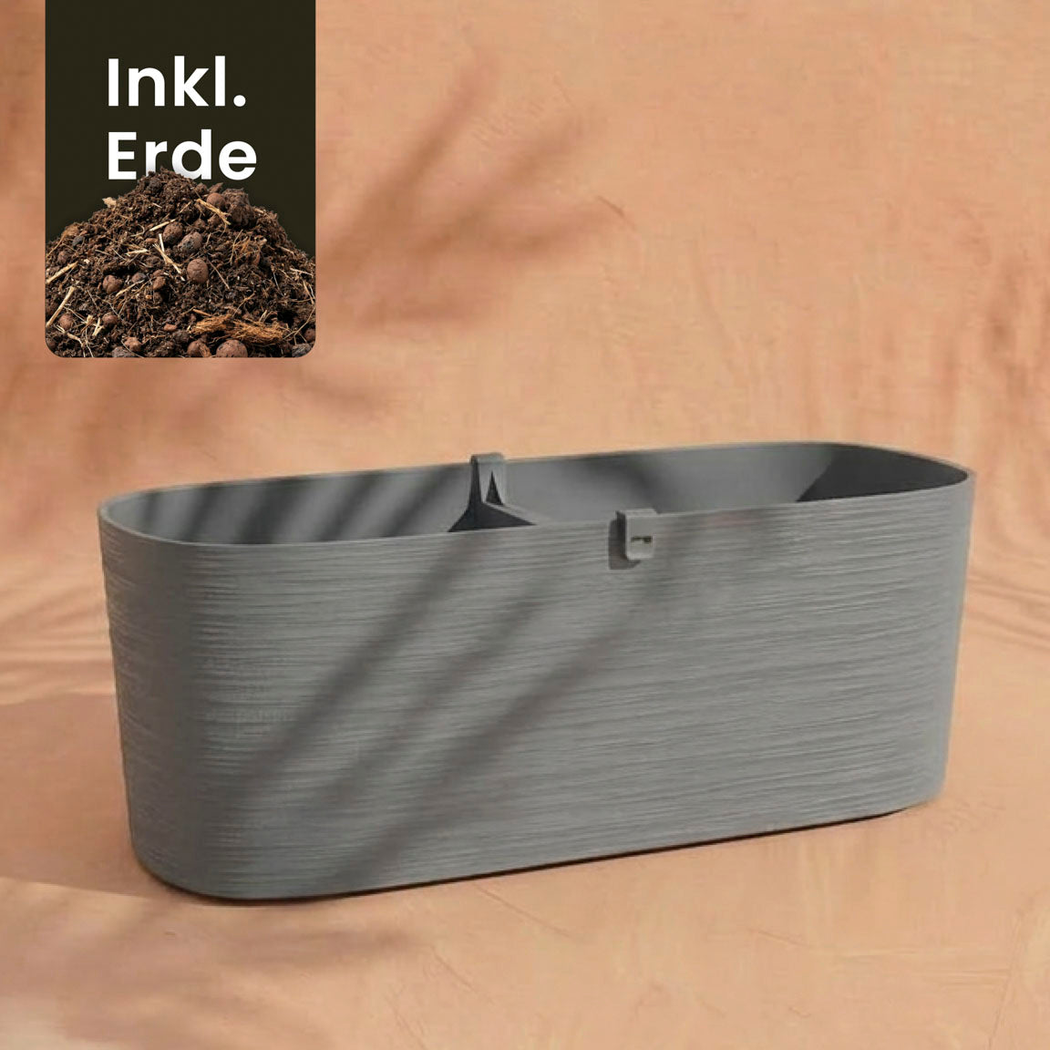 Der Pflanzkasten (Paros | 60 cm) ist ein großes, rechteckiges graues Pflanzgefäß auf pfirsichfarbener Oberfläche. Ein Einsatz zeigt Erde mit "Inkl. Erde". Er ist ideal für Balkonpflanzen, da er gut entwässert.