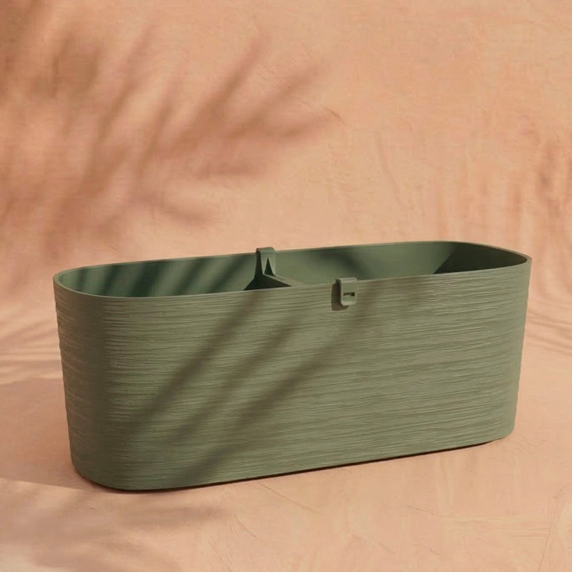 Der Pflanzkasten (Paros | 60 cm) ist ein grünes, ovales Pflanzgefäß mit strukturierter Oberfläche und eingebauter Drainage, das auf einem zart pfirsichfarbenen Hintergrund mit Blattschatten abgebildet ist.