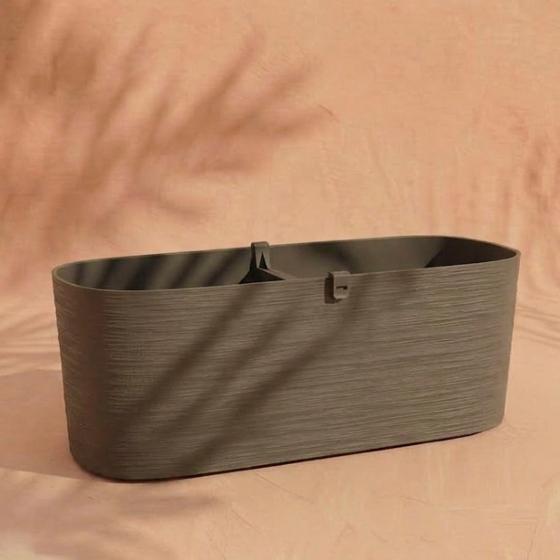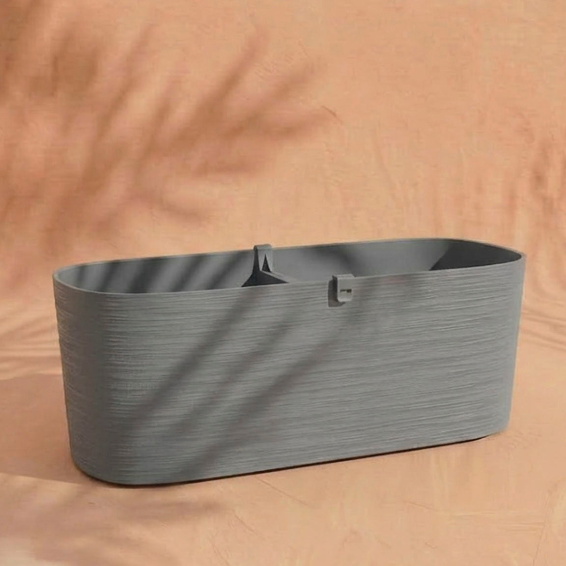 Der graue Pflanzkasten (Paros | 60 cm) mit Mitteltrennwand ruht auf einer pfirsichfarbenen Fläche, die von weichen Blattschatten durchzogen ist - ideal für Balkonpflanzen mit ihrem praktischen Drainagesystem.