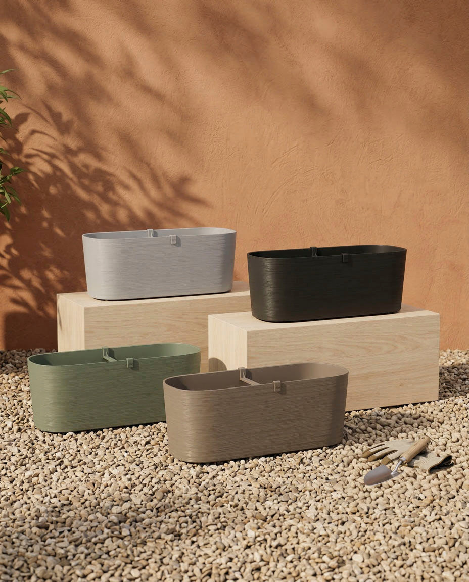 Vier rechteckige Pflanzkästen (Paros | 60 cm) in Grau, Schwarz, Grün und Taupe stehen auf Holzklötzen und Kies zur Entwässerung. In der Nähe stehen Gartengeräte, dahinter wirft eine warme Stuckwand blattreiche Schatten.