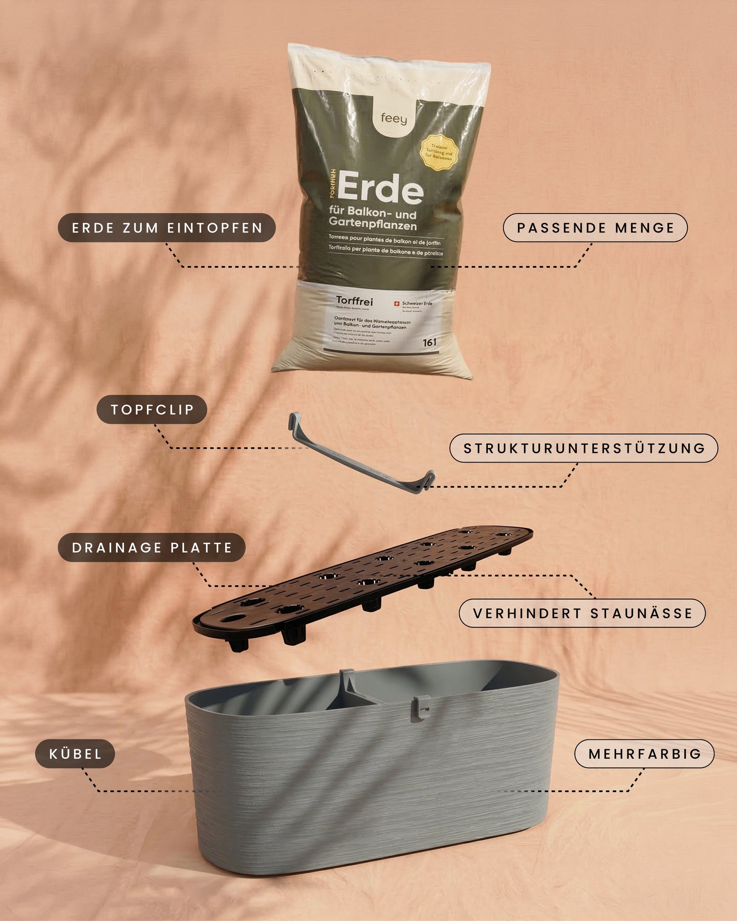 Der Topf enthält ein Drainage-System, damit die Wurzeln deiner Pflanzen nicht im Wasser stehen. Dennoch bleibt die Erde über längere Zeit gut befeuchtet. 🤗