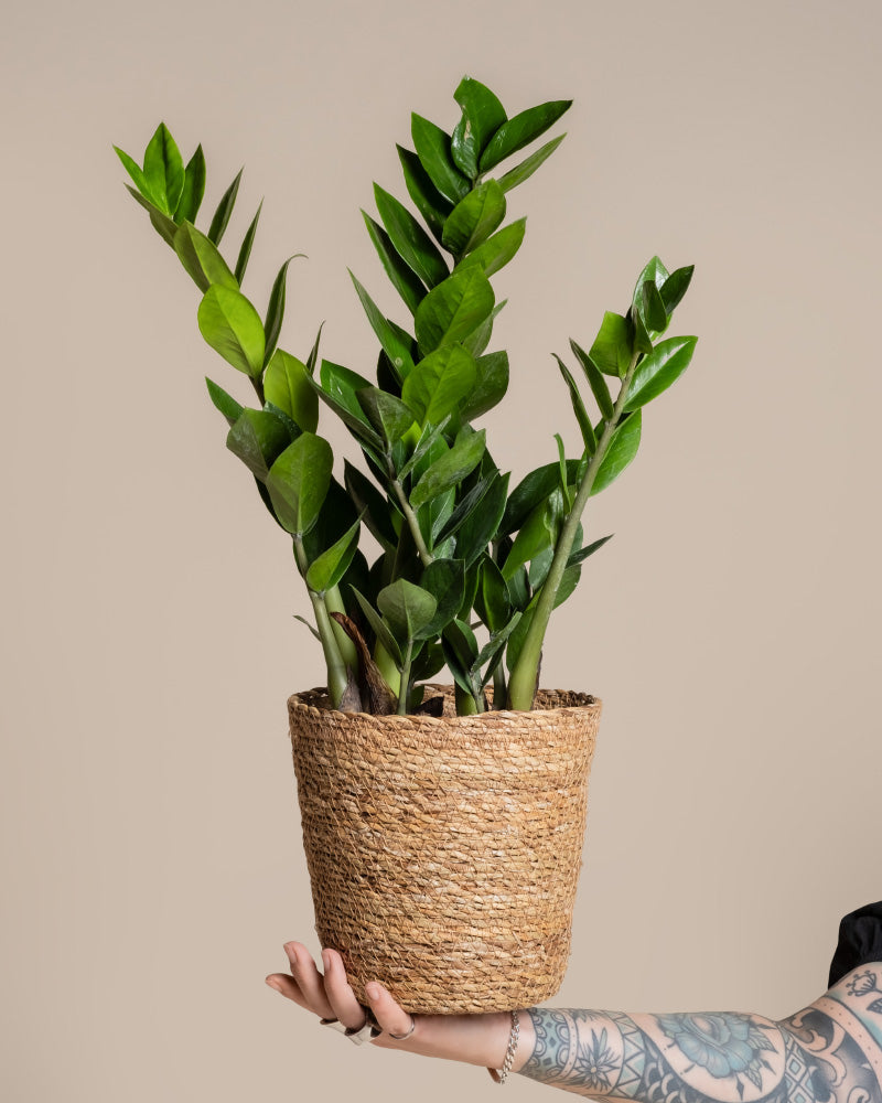 Eine tätowierte Hand hält einen Pflanzkorb aus Seegras (Kesat | 18 cm ⌀) mit einer gesunden ZZ-Pflanze mit glänzend grünen Blättern vor einem einfarbig beigen Hintergrund hoch.