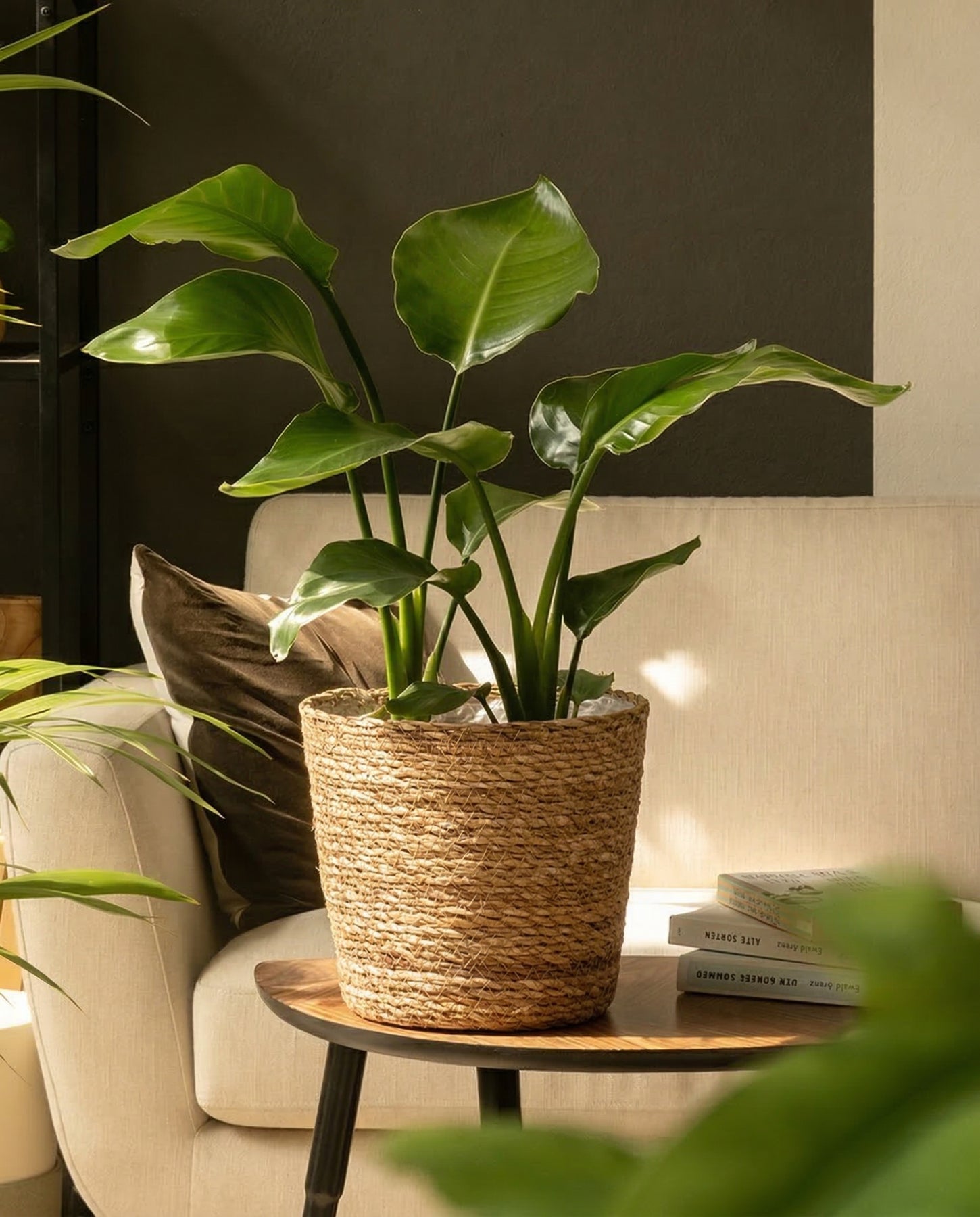 Eine leuchtend grüne Pflanze mit großen Blättern steht in einem geflochtenen Pflanzenkorb aus Seegras (Kesat | 22 cm ⌀) auf einem hölzernen Beistelltisch neben einem gepolsterten beigen Stuhl. Sonnenlicht fällt hindurch, wirft einen warmen Schein auf die Pflanze und schafft eine sommerliche Oase. Neben der Pflanze auf dem Beistelltisch steht ein Stapel Bücher.