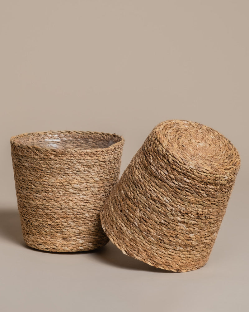 Nahaufnahme von zwei handgefertigten Pflanzkörben aus Seegras (Kesat | 18 cm ⌀) mit detailreicher Webstruktur und natürlichen Fasern - perfekt als stilvoller Pflanzkorb für Ihr Zuhause.