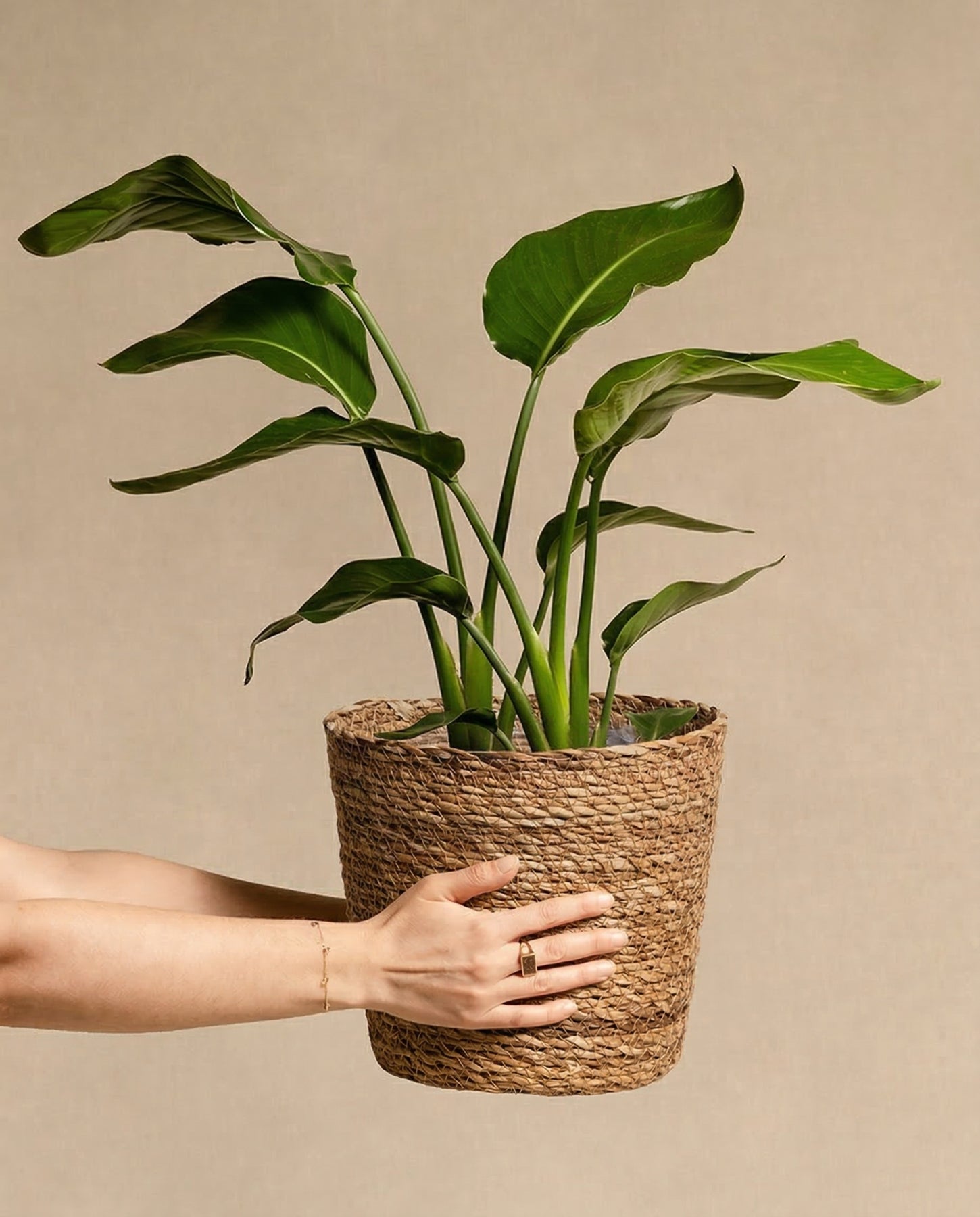Eine Hand hält eine Topfpflanze mit breiten grünen Blättern in einem geflochtenen Pflanzenkorb aus Seegras (Kesat | 22 cm ⌀) vor einem schlichten beigen Hintergrund und schafft so eine sommerliche Oase.