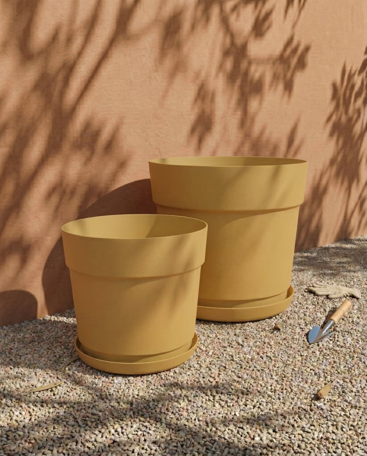 Zwei große, leere, gelbe Pflanzkübel-Sets &