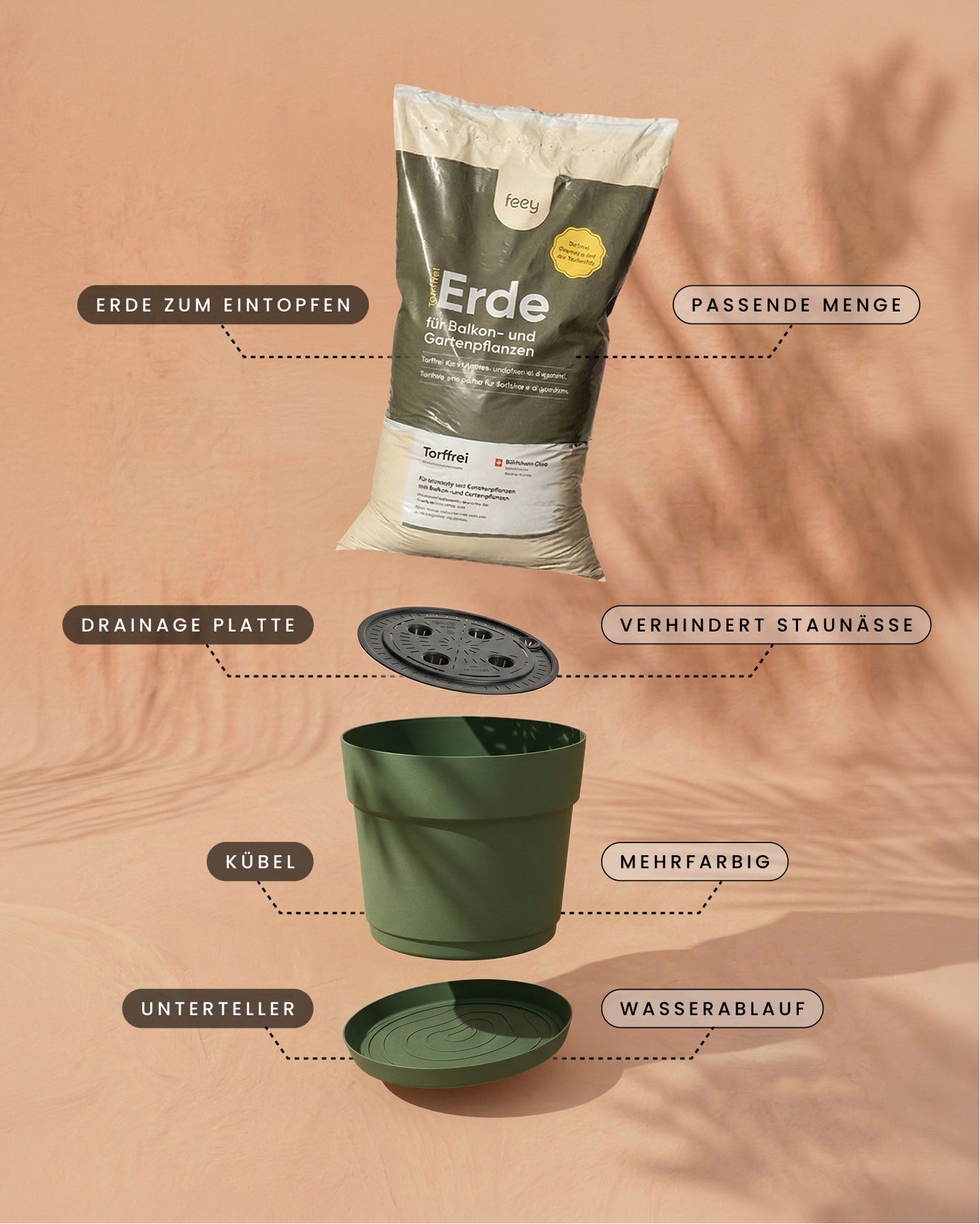 Ein beschriftetes Diagramm zeigt das Pflanzkübel-Set &