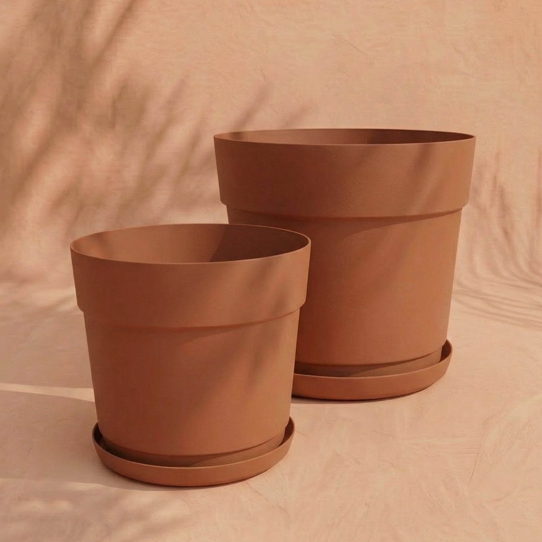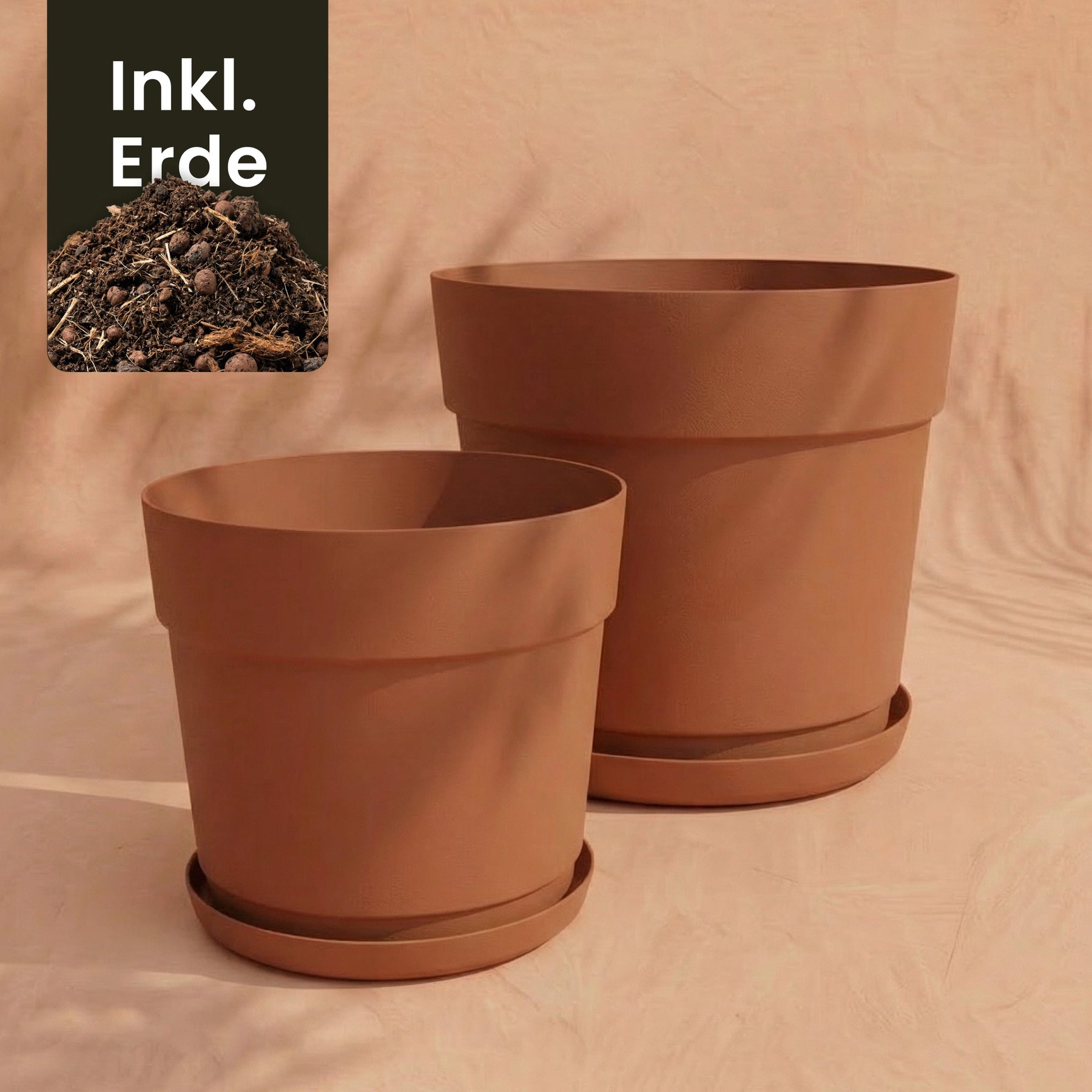 Zwei leere, hellbraune Pflanzkübel-Sets &