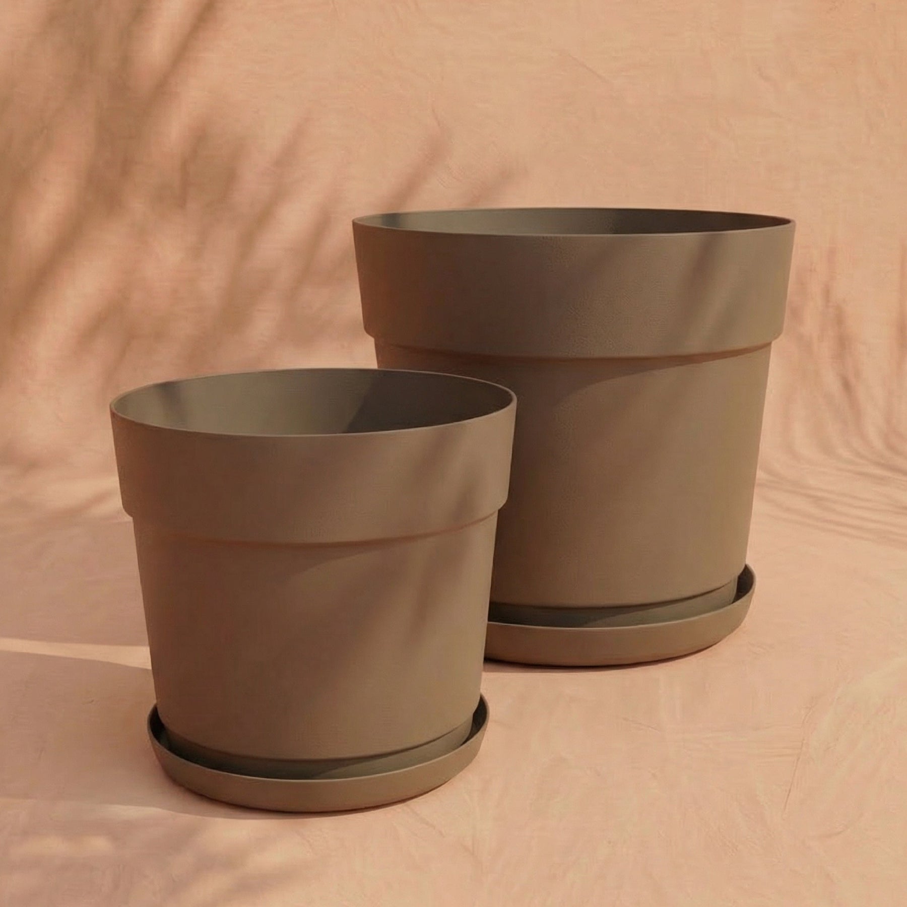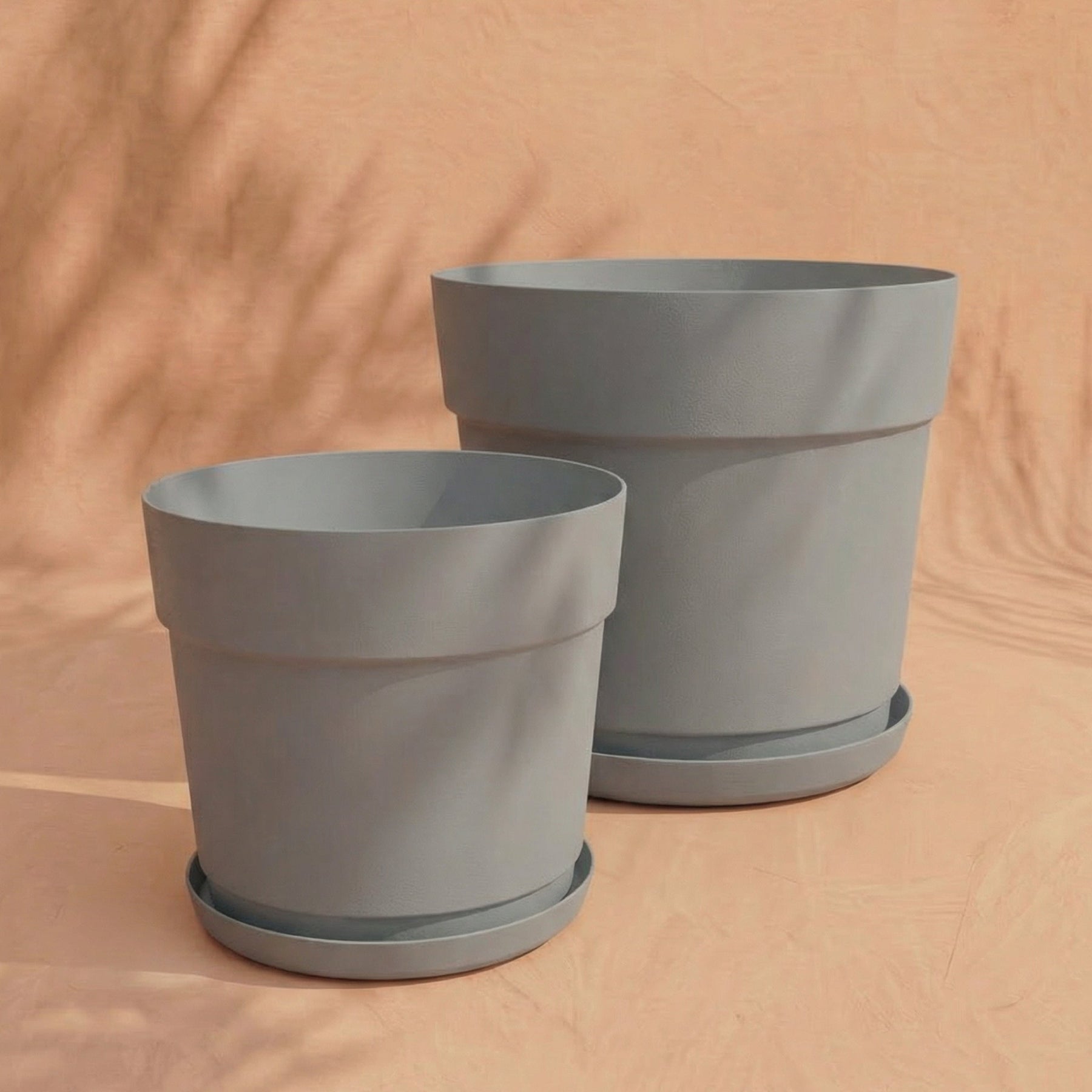 Zwei leere, hellgraue Pflanzkübel aus recyceltem Kunststoff des Sets &