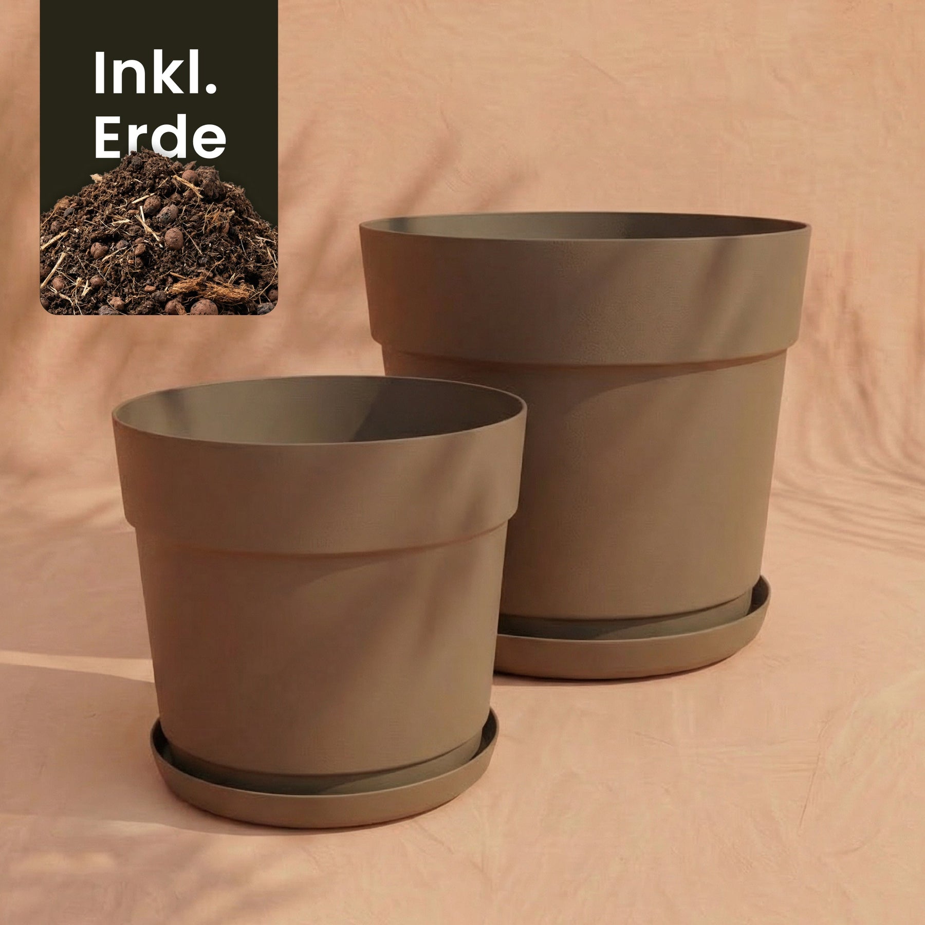 Zwei braune Pflanzkübel aus recyceltem Kunststoff aus dem Pflanzkübel-Set &