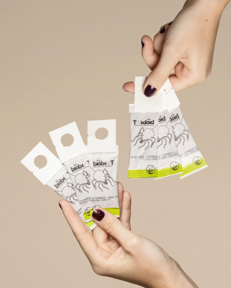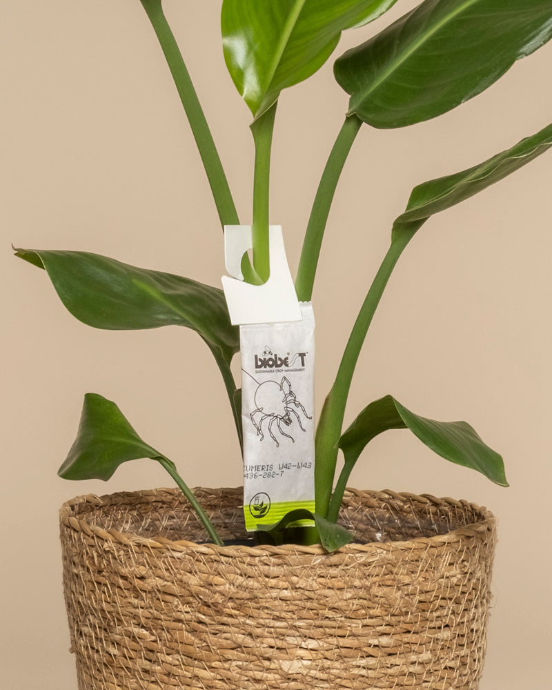 Ein weißes Tütchen mit der Aufschrift "biobest" und einem Spinnenbild hängt an einem weißen Papierhaken an einem grünen Pflanzenstängel; darin befinden sich Raubmilben gegen Thripse. Der Hintergrund ist beige.