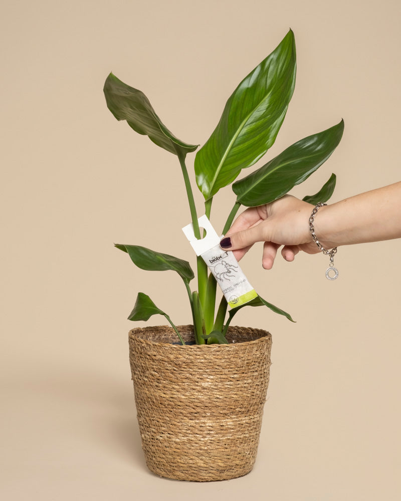 Eine Hand bringt ein Schild an einer grünen Topfpflanze in einem geflochtenen Korb an, auf dem Raubmilben gegen Thripse abgebildet sind, um ihre Wirksamkeit bei der Bekämpfung von Thripsen hervorzuheben.