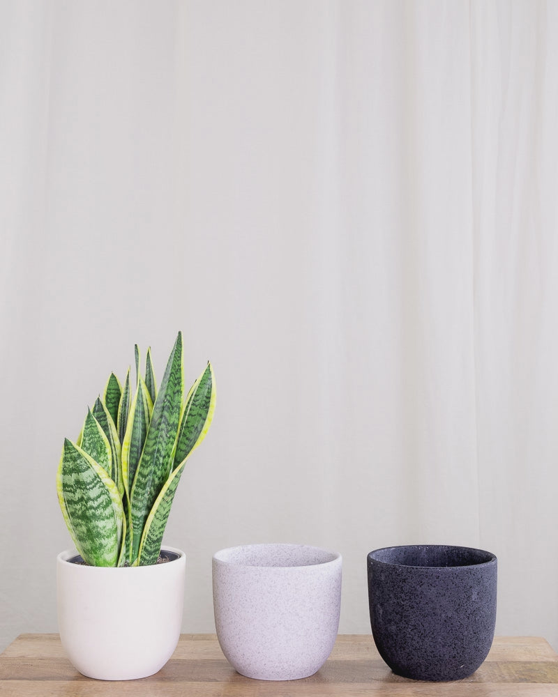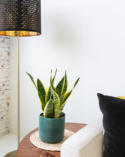 Eine Schwiegermutterzunge mit hohen, spitzen grünen Blättern mit gelben Rändern steht in einem modernen Keramik Topf auf einem Pflanzenständer von feey.